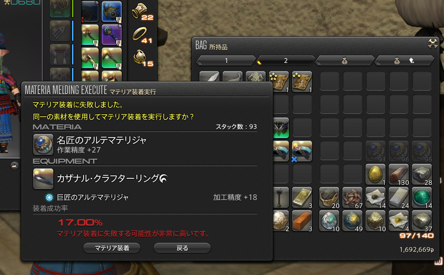 ところで、ほんっと、この禁断するときのマテリア装着の成功率って何なのでしょうかね。確率ほんまあってんのかー!?といいたくなるくらいぱりんぱりんする時がありますよね。