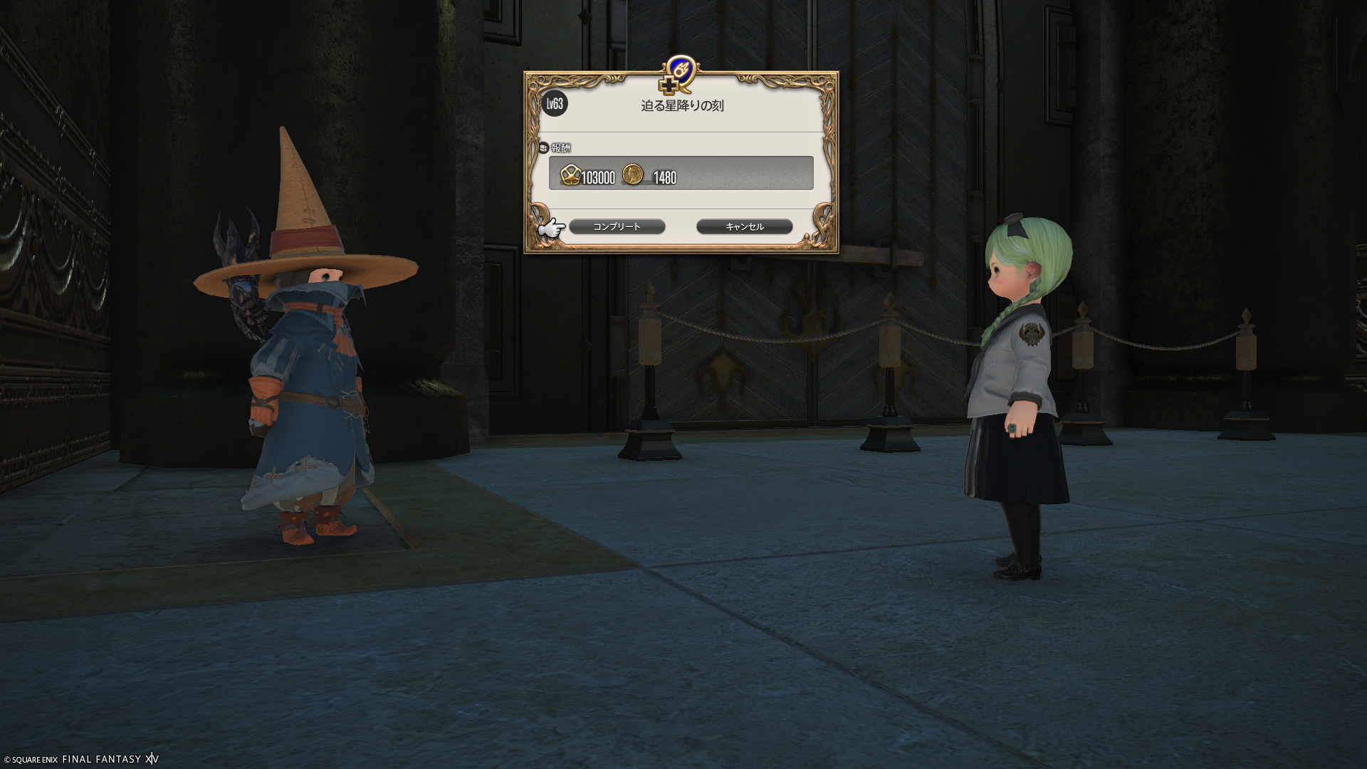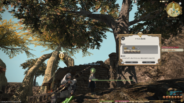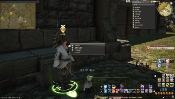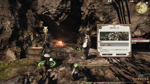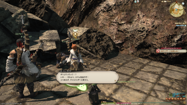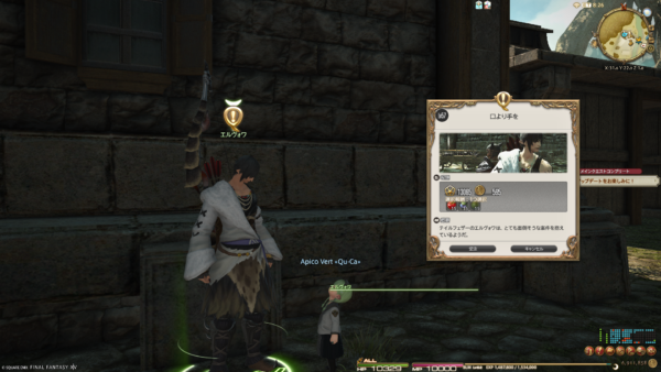 詩人クエスト…?もしくは普通のクエストかなぁ。なんか、ベテラン猟師とペアを組みたいミコッテさんだった気がします。こういうクエスト類は、一気に終わらせる方がお話はすんなり入ってきそうではありますよね…。