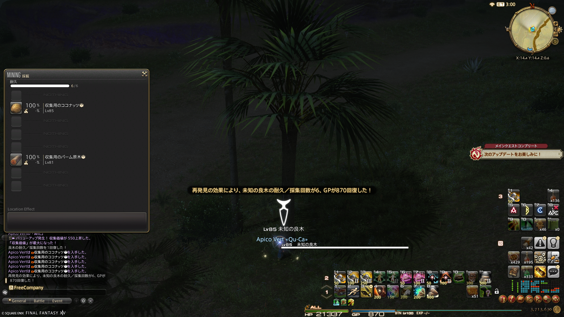 リテイナーでは追い付かないので、せっせと自ら素材を取りに行ったりしているのですが、合間で未知の採集ポイントタイムになると、ついそちらに行ったりしちゃいます。ギャザラーのスクリップも貯めておきたいですしね~。