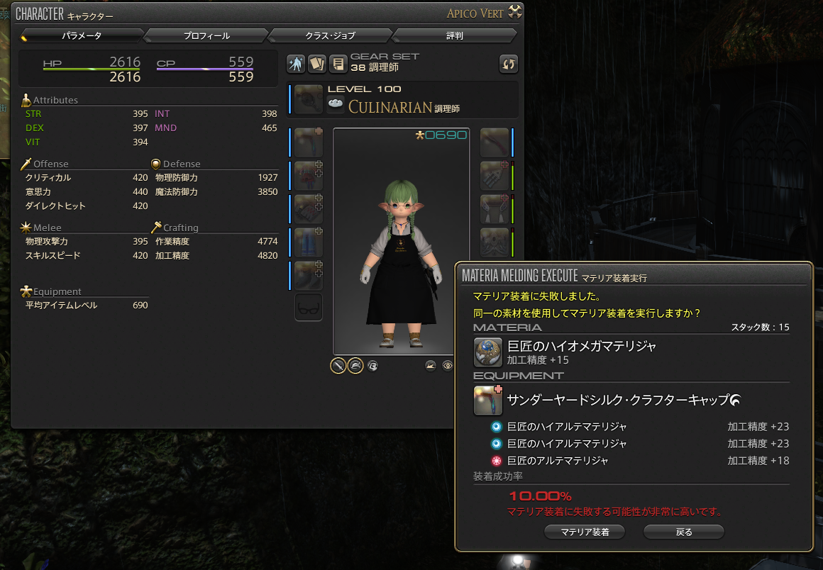 クラフターのレベル100向け装備、確定枠は現在のレベル帯向けのものを装着したのですが、マテリア枠を超えた1つ目はLv90のマテリアで妥協。マテリア枠+1までは埋めたのでもういいかとも思ったのですが、伝説素材を使う装備を作るにはやはり心もとないので、せめて5部位はフル禁断しようかなと。