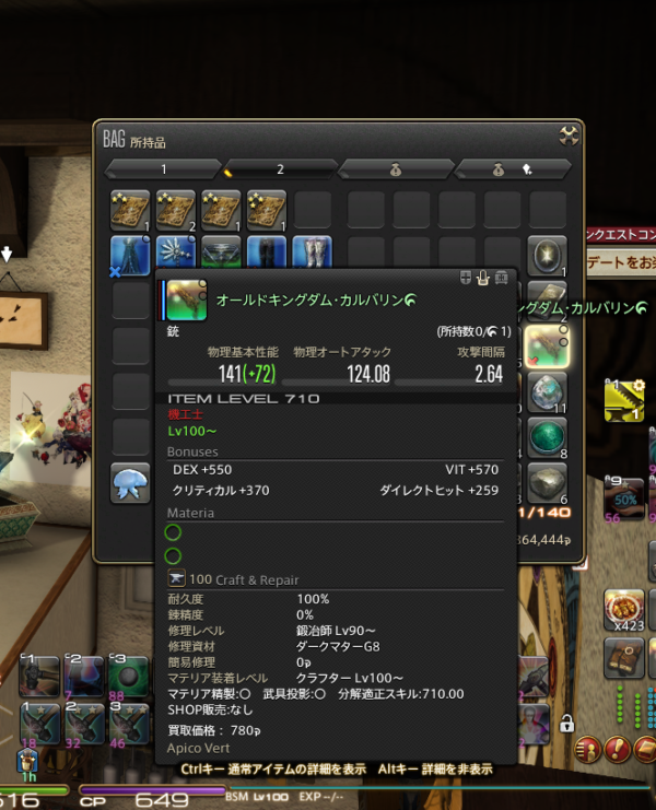 FCメンバーさんがせっせと伝説素材を取ってきたものを送ってくださっていたので、早く加工しなければと、装備の5部位は作ったのですが、HQ率をあげたくてクラフター装備のマテリアを禁断して充実させようと作業を中断したため、残りの武器とアクセサリーがまだできておらずで…。