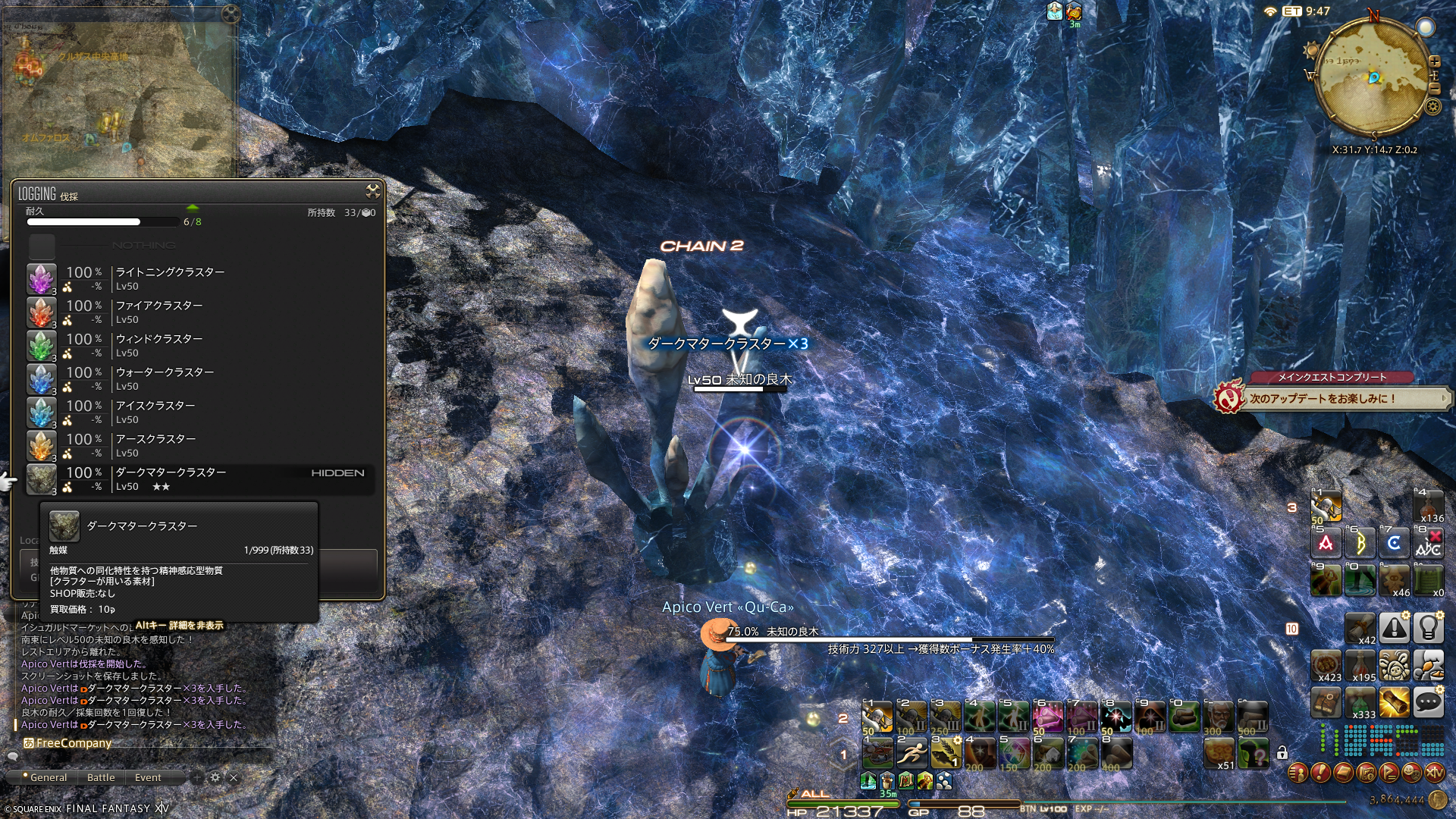 このクラスターを何とかしてクリスタルにできたりしたらいいのに…と時々思います。最近クリスタルの消費が多すぎて補充が間に合わないよー。まあ、倉庫にある程度貯めているので、困ることはないのですが。