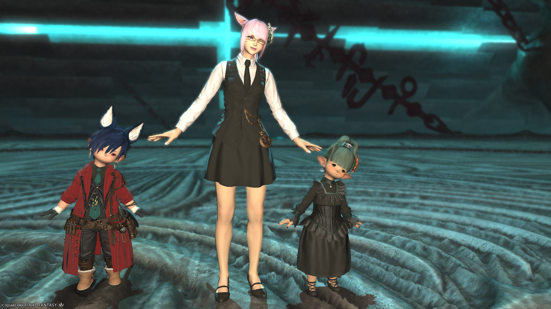 あと、一番左のミコッテさん、地図ツアーでソフトツーブロックをもらったのでさっそくチェンジ。普段の髪型より似合っている気がします…。