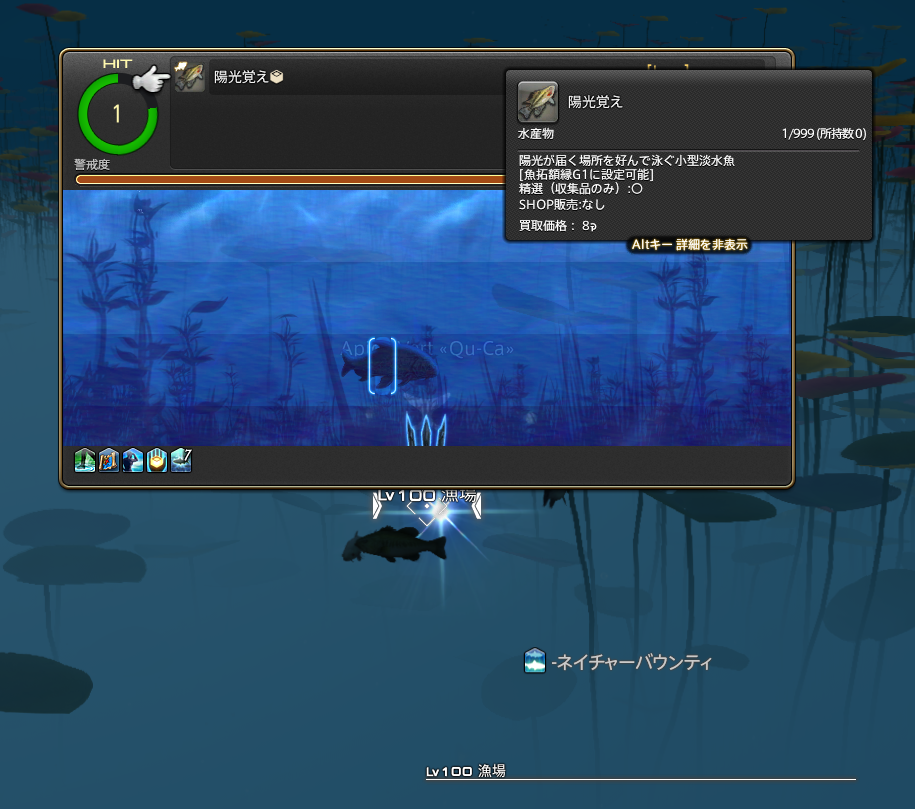 刺突漁をしていてちょっと嫌なのが、魚をついた後、たまにカーソルがアクティブになってしまって、突いた魚のところにカーソルが行っちゃうこと…。上の写真がそうなのだけど、入手した魚のところにカーソルが勝手に行って、カーソルONでアイテム説明が出ちゃうんです。