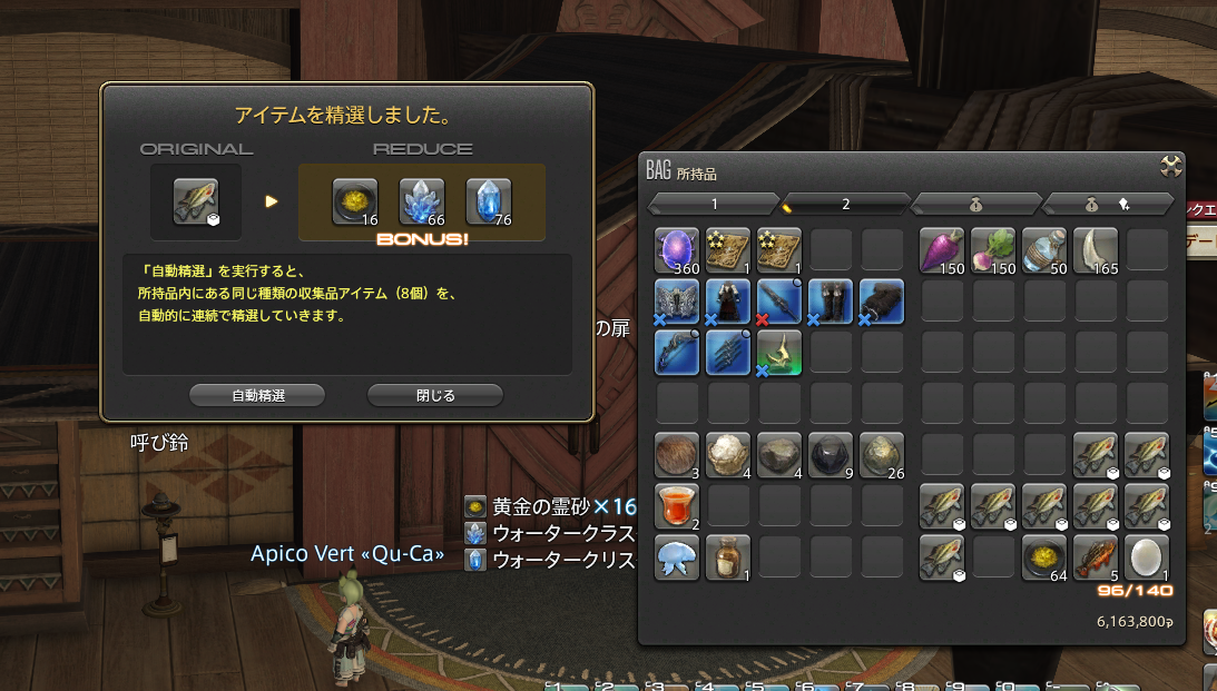 釣ってきたお魚を精選して、黄金の霊砂を補充。砂は結構使うので、時々とりに行っております。