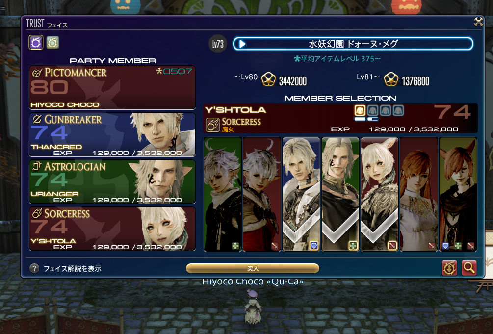 まだフェイスのレベルが上がってないけど、Lv80以下だと漆黒ダンジョンでもりもり経験値が入るので、2回ほどダンジョンに入ればフェイスのレベルが上がる感じで、サクサクレベル上げはできます。