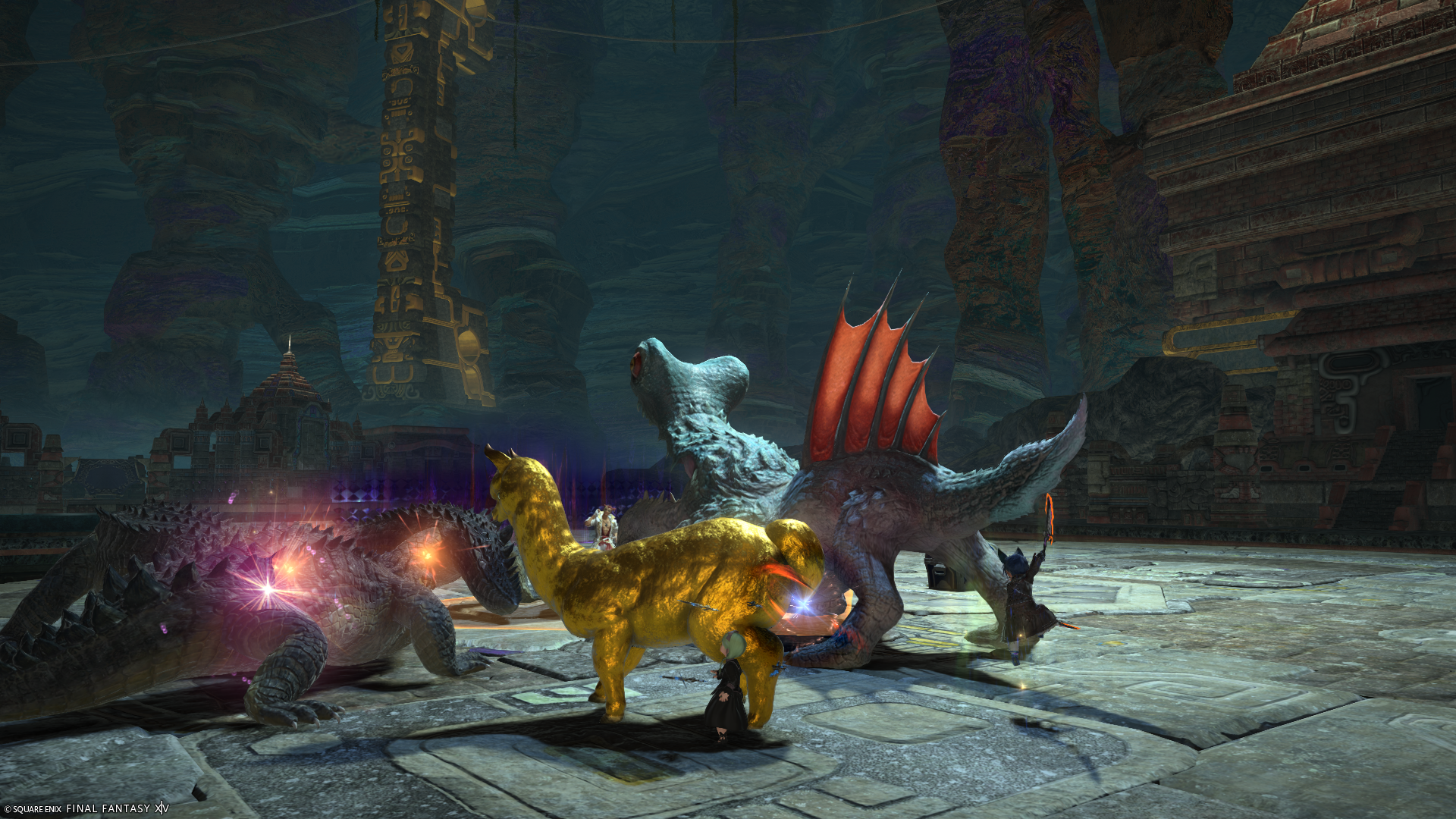 G17の宝の地図で発生する転送魔紋で転送された先ででてくる、ボーナスの宝箱を落とす金ぴかモンスターたちがかわいいので、戦闘そっちのけで撮影してたんですけど…