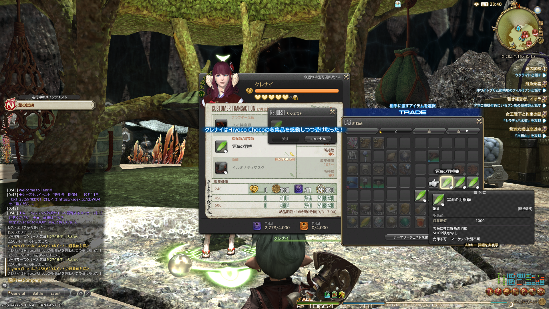 倉庫ちゃんの方はまだクラフターもギャザラーもLv90代なので、お得意様取引でたくさん経験値が入るのがありがたいです。だいたい1か所で1Lvは上がりますよね…すごい。