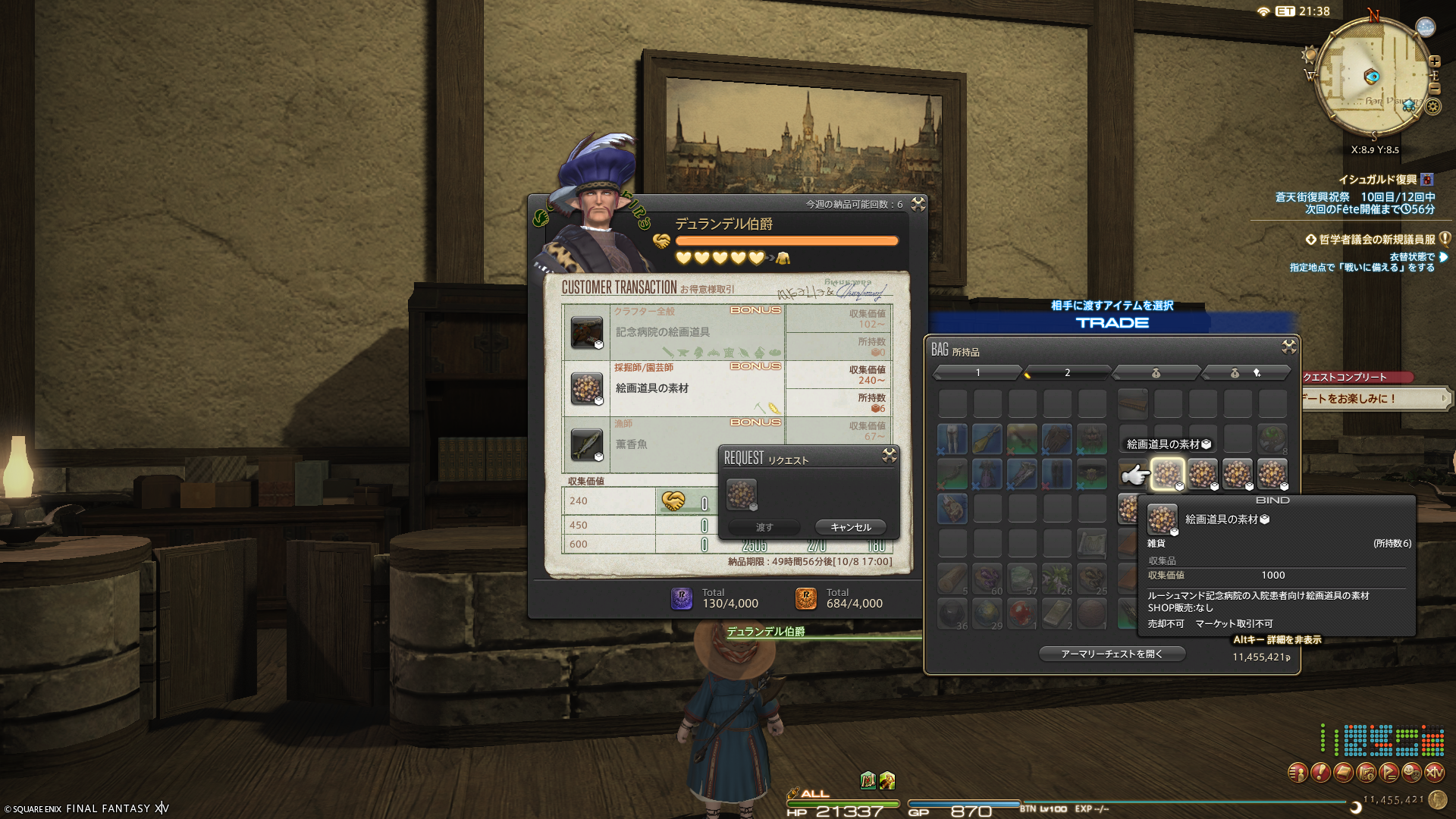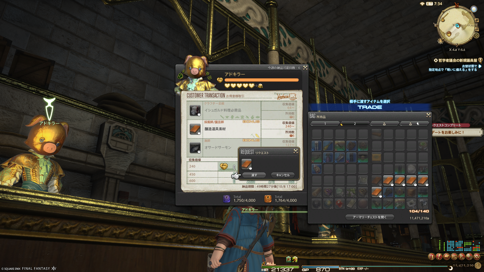 前に、クラフターとギャザラーのボーナス両方ついてるお得意様取引のとき、ここで全部済ませられるじゃん!とか思って、両方の納品物用意したら、1人6個までだったー!ということをしたことがあるわたくしでした。