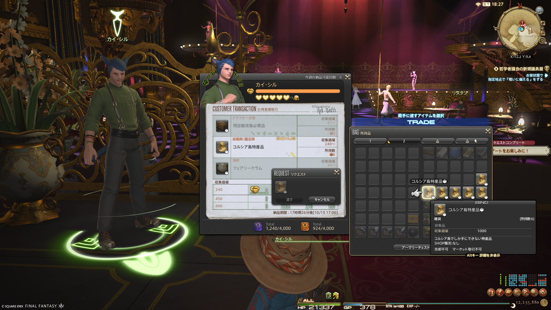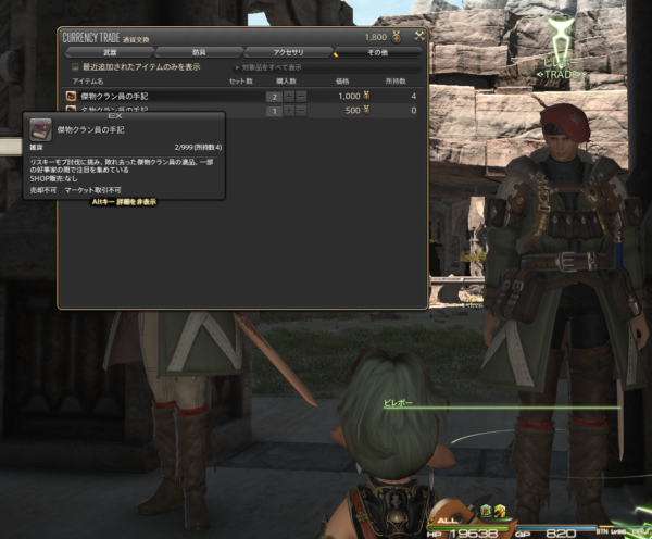 本体でお得意様をしていないということは、倉庫ちゃんでもしてないということでありまして。お得意様取引は、貴重な倉庫ちゃんのギャザラー&クラスターのレベル上げのチャンスなのです。