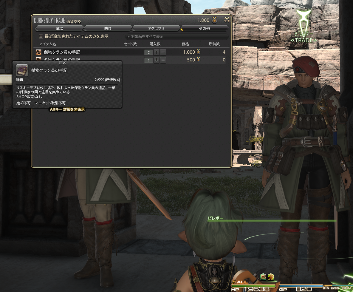倉庫ちゃんでも欲しかったんですよね。もう1つ「怯える」エモートも同様に傑物クラン員の日記と交換でもらえるので、がんばってポイントを貯めて交換するぞー!