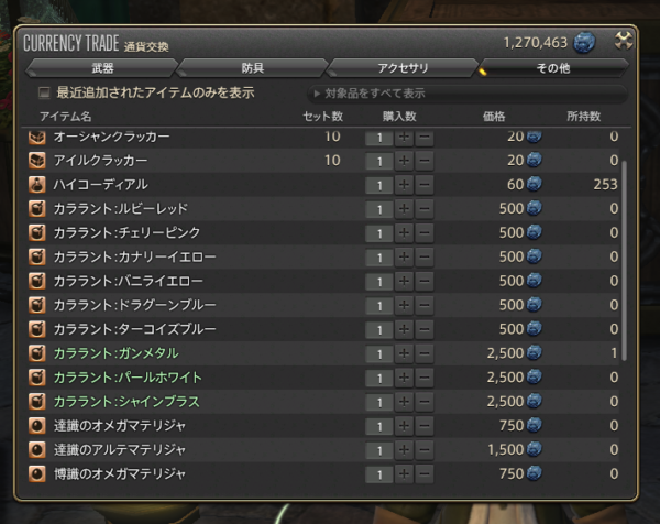 青船貨たくさんあるので、2500で交換できるちょっとレアな色を1つずつもらっておきました。とくに使う予定はないんだけれども…。
