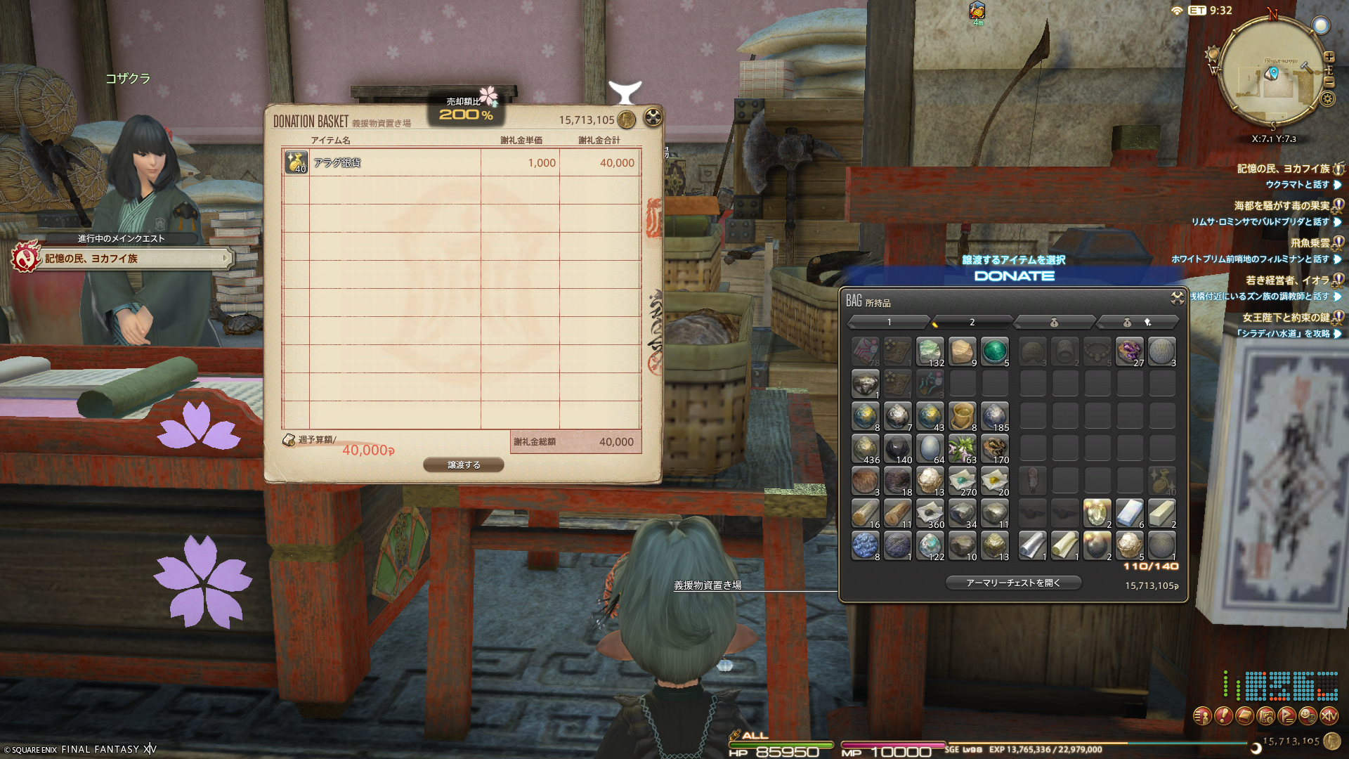 倉庫ちゃんではずーっとクエスト報酬の小銭を貯めてたので、せっせと小銭を納めて荷物を減らしております。