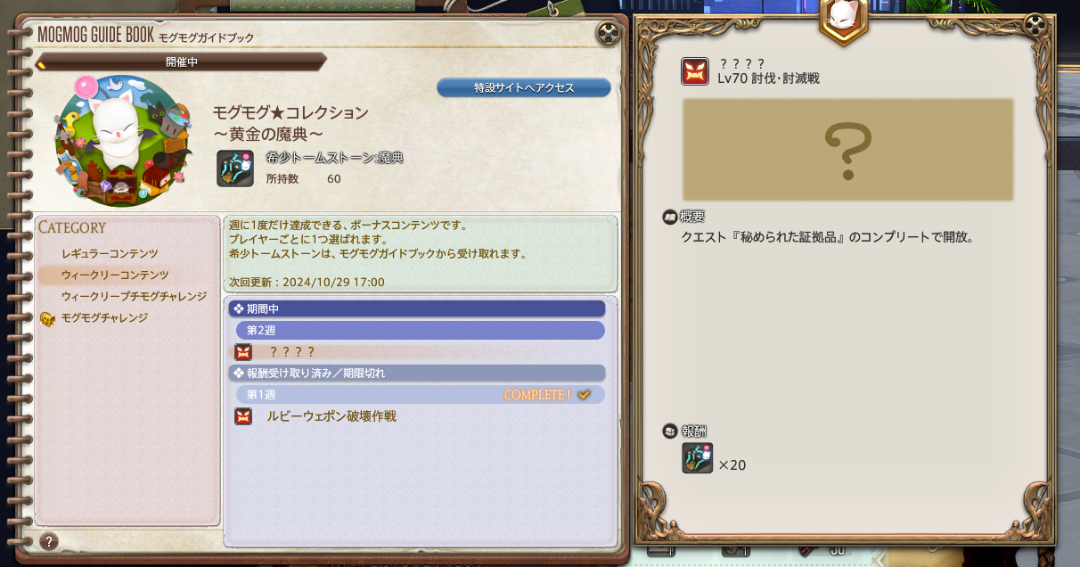 そういえばモグモグ★コレクションのウィークリーコンテンツなんだろう?と思ってチェックしたら、まさかの未開放コンテンツでした。