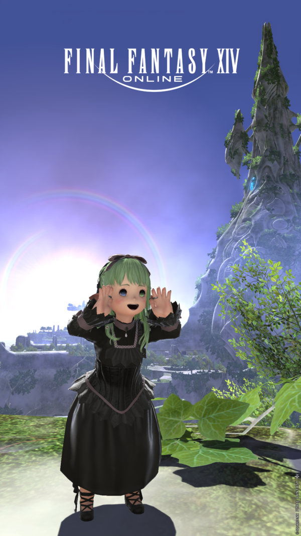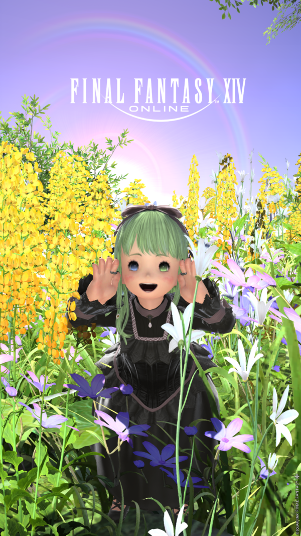FF11のル・オンの庭もきれいだけど、FF14のル・オンの庭もとってもきれいです。お花がたくさん咲いていてきれいだし、後ろには虹も出てるよ~。