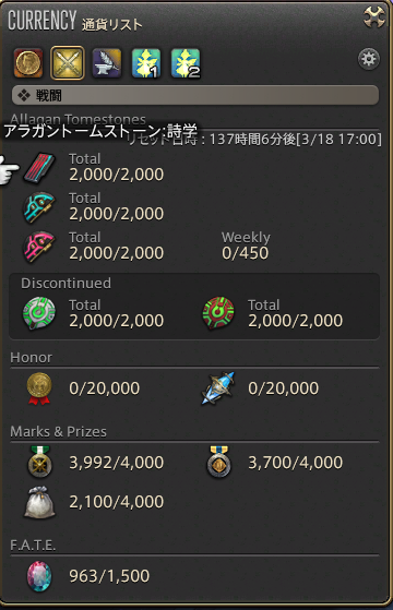 あれ?天道がもらえてない!?って思ったら、アラガントームストーンがすべてMAXになっておりました。今週全然稼げてなかった!
