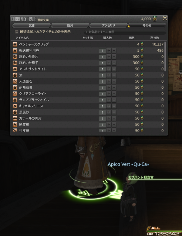 貯まっていたポイントのモブハントの戦利品を転送網利用券と交換したあと、新生エリアの新しい手配書をもらい、リスキーモブを倒してからおやすみなさい。