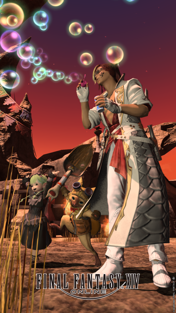 シャボン玉エモートしてるFCメンバーのヘンナミコッテさん。この角度のこのエモートのポーズ、いつもと違って(ヒドイ)イケメンに見えなくもない気がするのですが(いつもよりちょっと幼くも見える)気のせいにしようと思います。