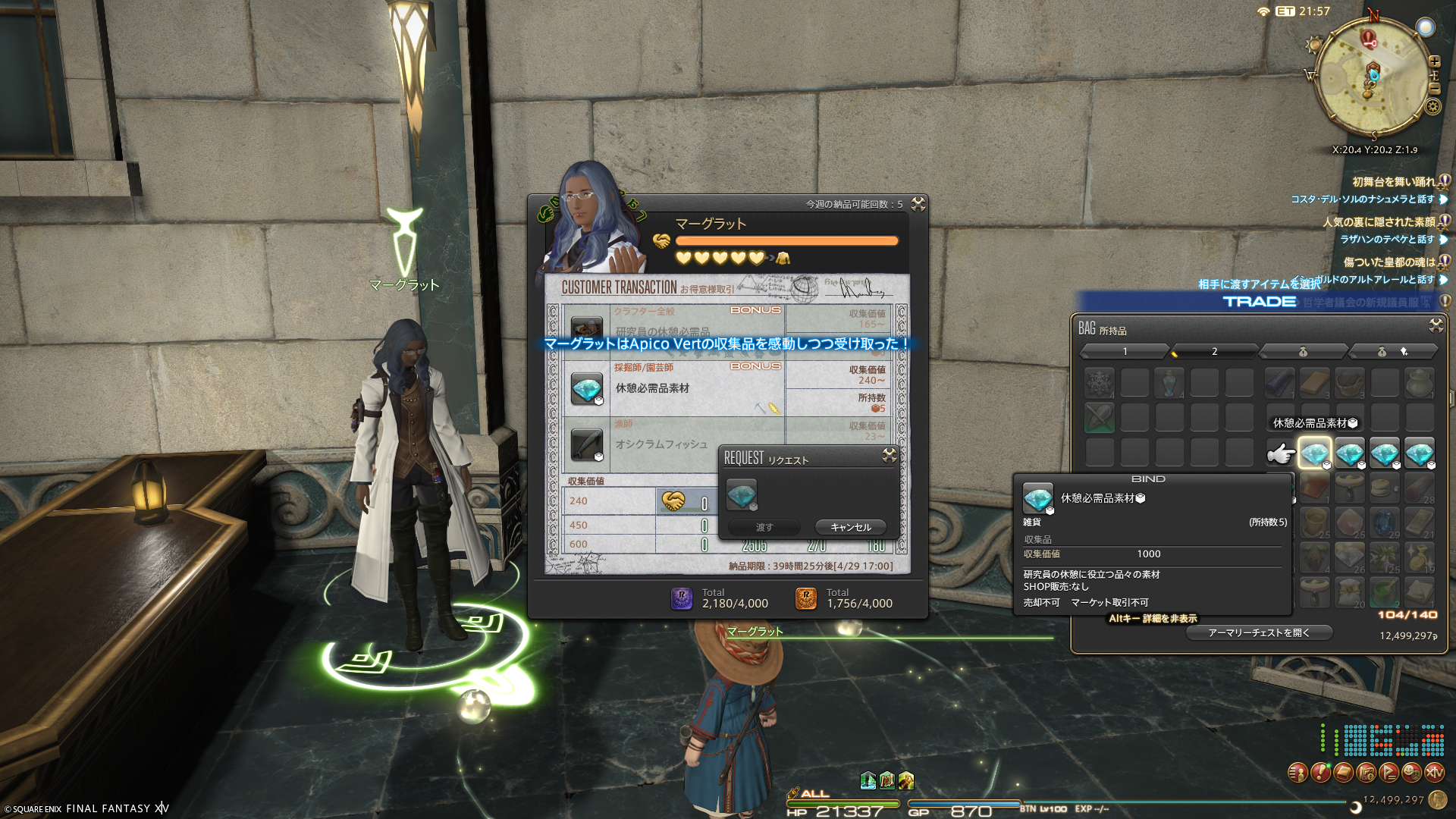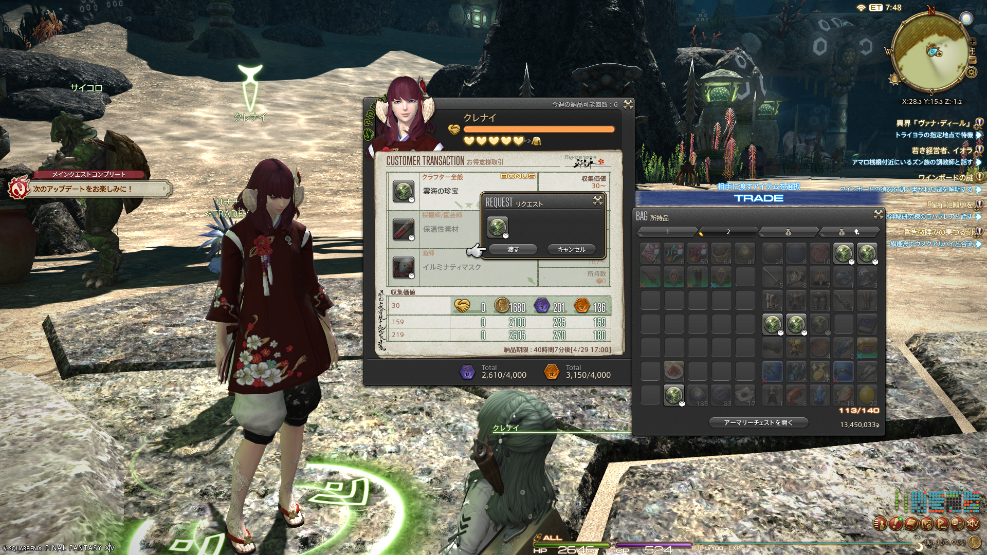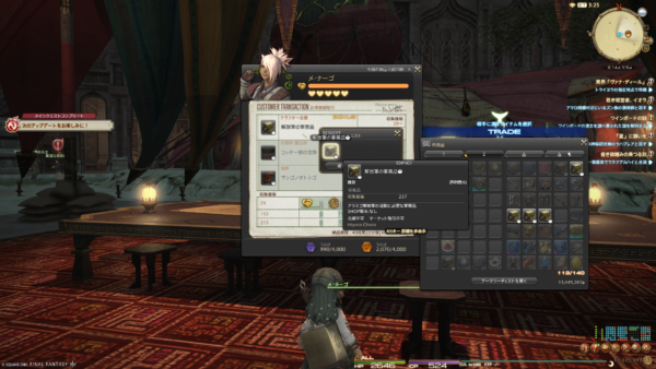無い素材は自分でも調達したり、FCメンバーさんに要求したりして、手元に少しあった素材と合わせてちまちまエバーシーク装備を作成しました。