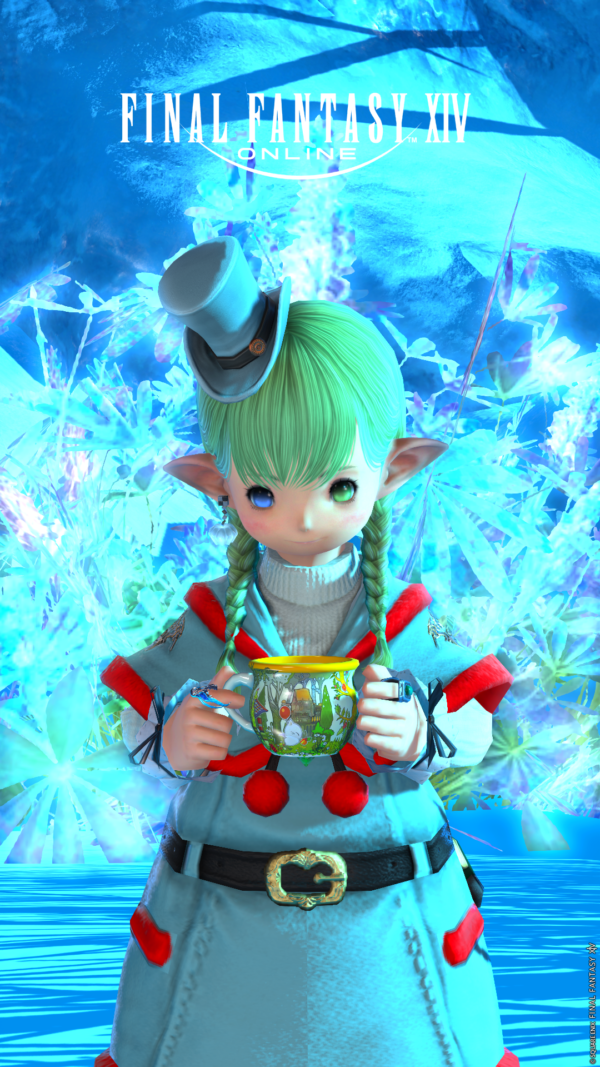クフィム島で星芒祭イベントでもらったエモート、森都風マグカップで飲む。