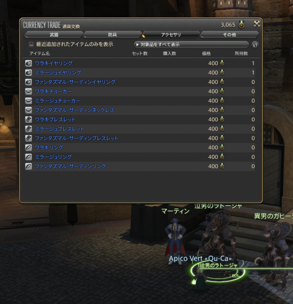 そろそろお正月ミラプリを変えようと思ったついでに、ドレッサーを整理しようとしていて、青魔道士向けのアクセサリー類が欲しくなって。どうやって入手するのかなって思ったら、同盟記章との交換でした。