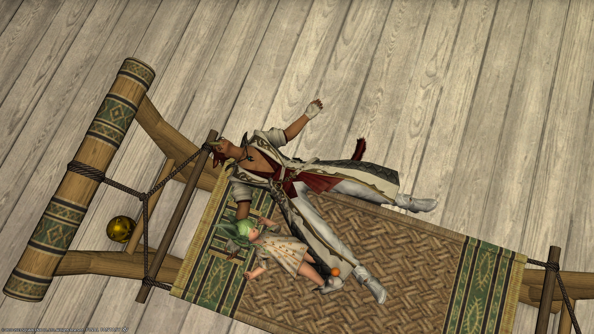 このミコッテさん、だれかがベッドで寝たりしてると、すぐに腕枕をしてくるのでありました。でも、このハンモックだと落ちそう…。かなり無理な体制になってます。