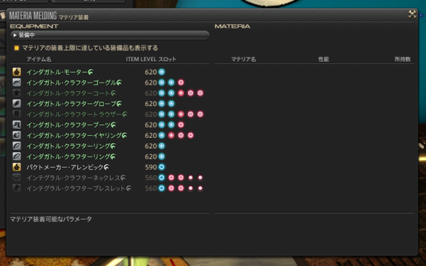 わたくし基本なんでも自分で調達したい派で、マテリアも自分で調達したい派なので、装備を精錬してマテリア精製しながら少しずつつけていけばいいかな?なんてのんびり構えていたのだけど、ある程度装備を整えないと制作自体できないので…。