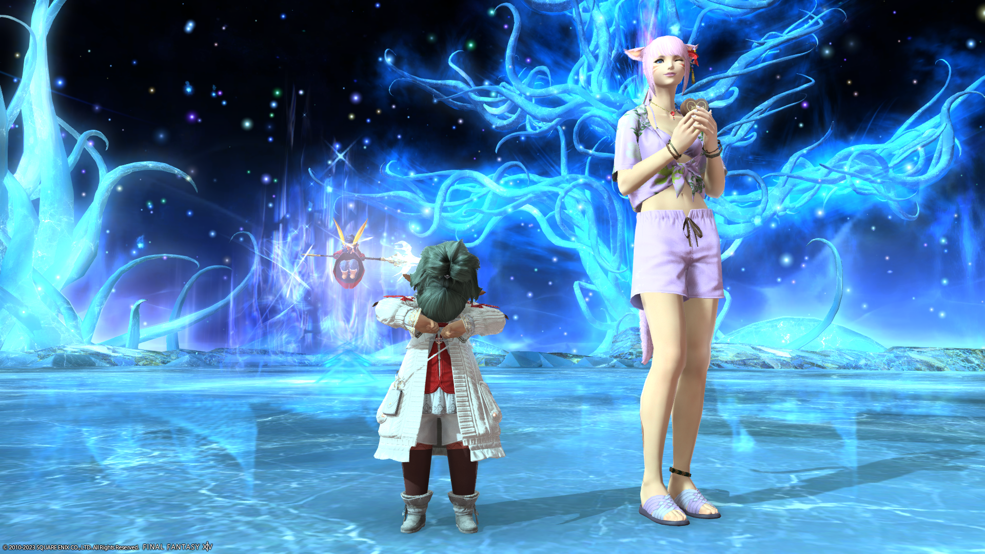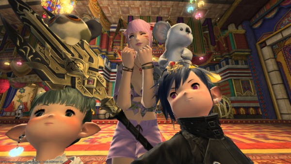 ちなみに左はわたくしの倉庫ちゃんで、右は王子様。後ろであざとくポーズを決めているのは、フリーカンパニーのミコッテさん倉庫のミコッテちゃん。