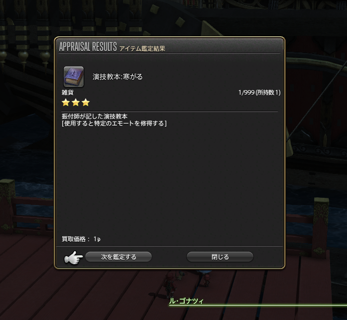 寒がるというエモート、なかなかいいお値段なのですよねー。倉庫ちゃんでは覚えたけど、本体の方が覚えてなくって。本体のが1個でたらいいなーと思っていたら……