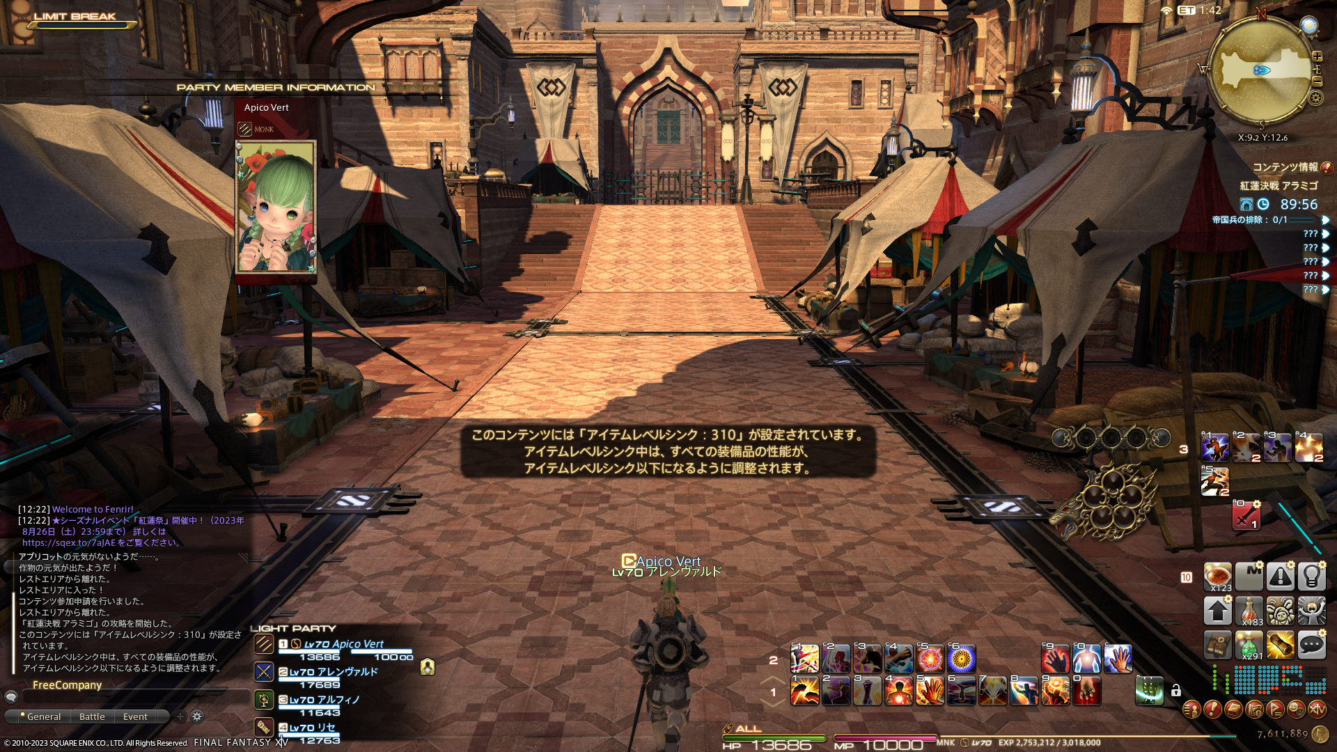 この後は、フリーカンパニーメンバーの王子さまの青魔道士のレベル上げへ!PL(パワーレベリング)で、一気にLv70から80になりました。