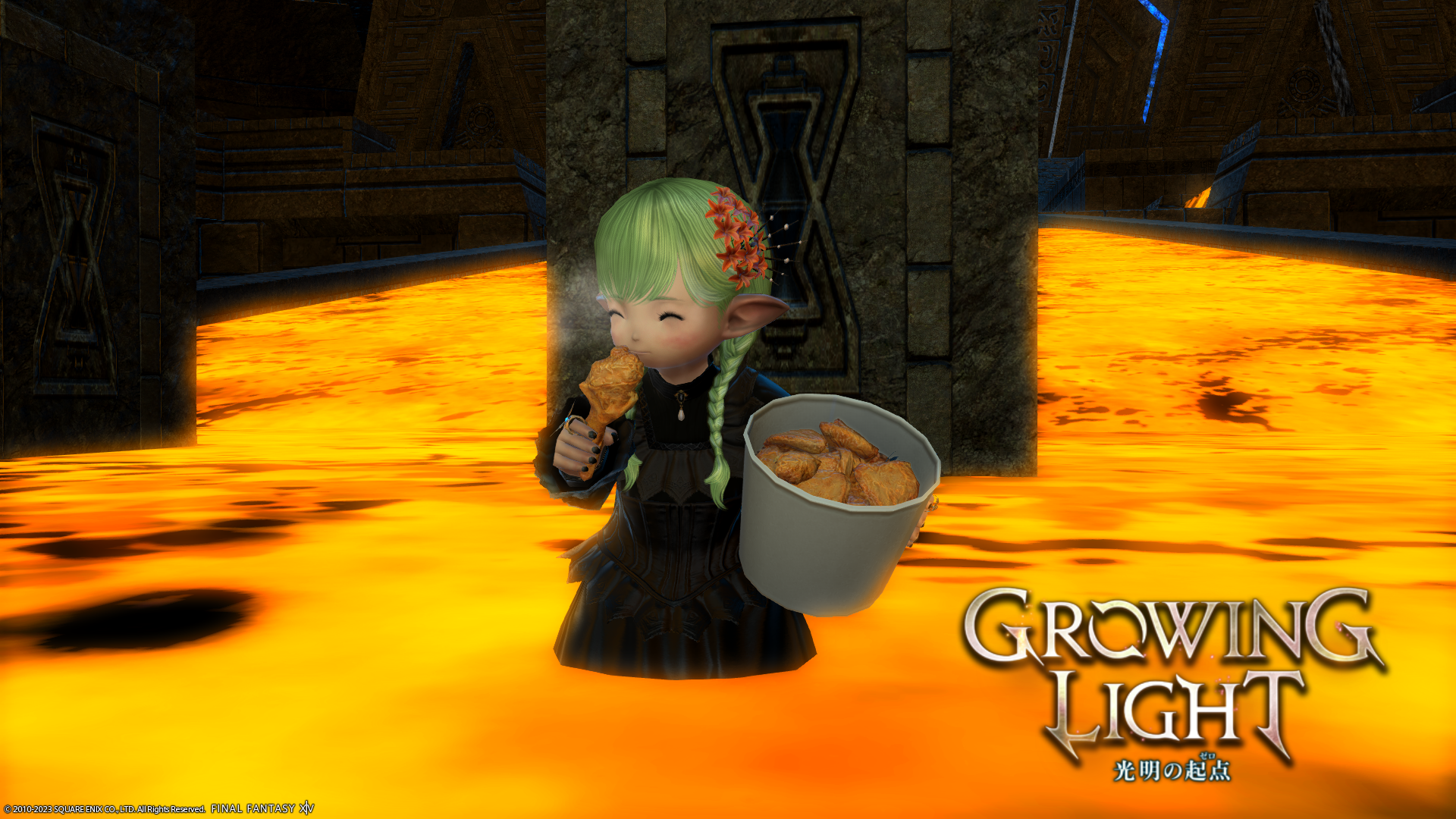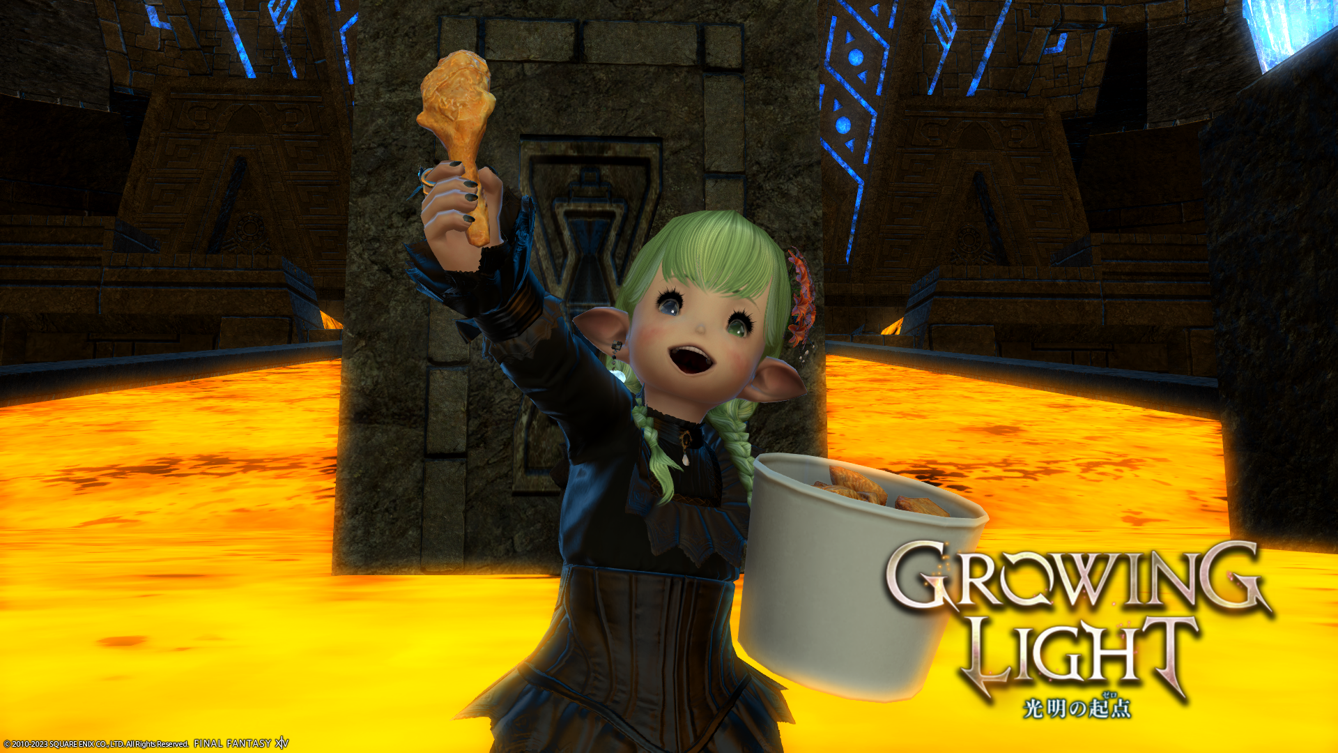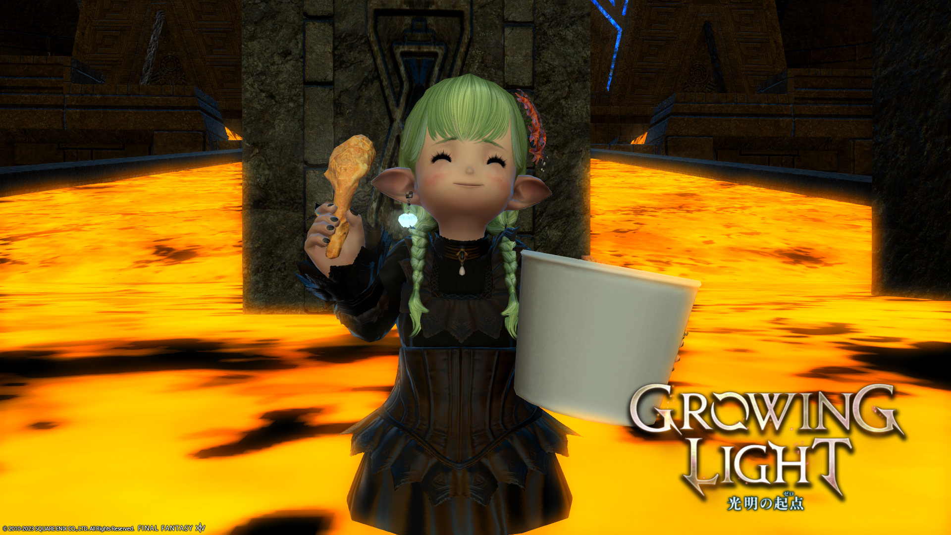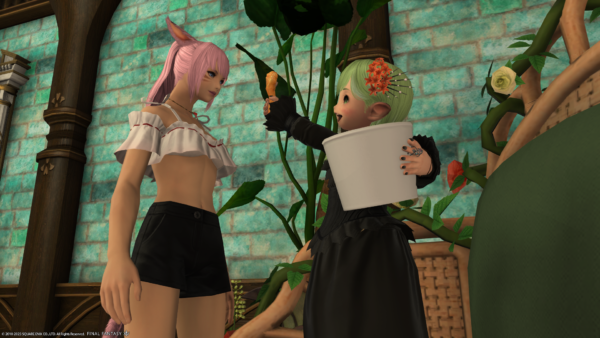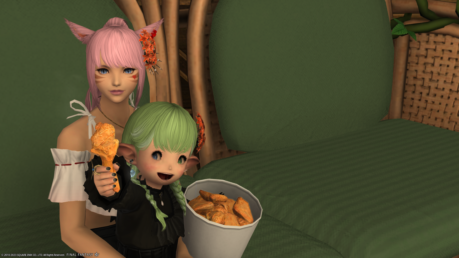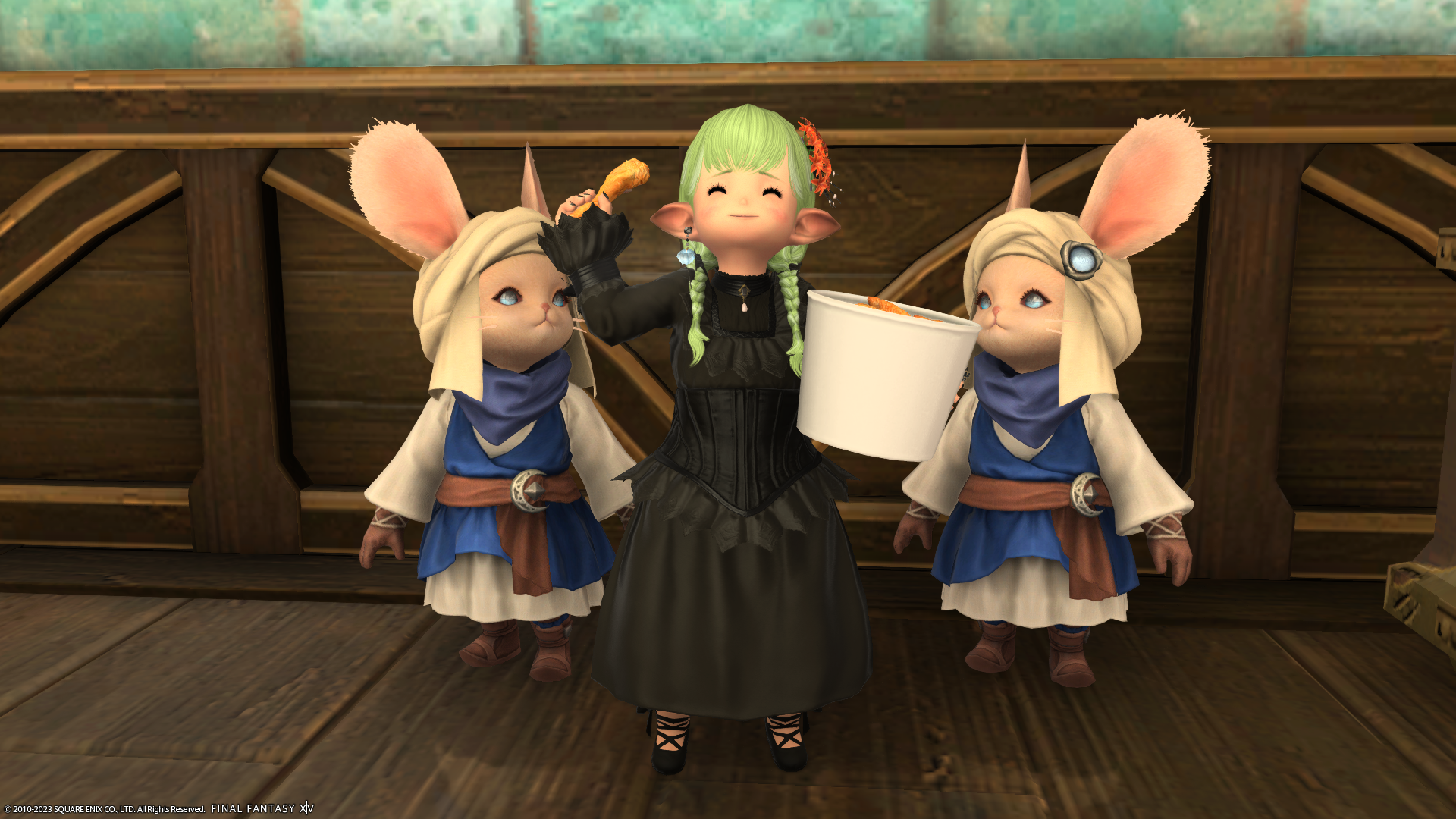 実はこちらのミコッテさん、KFCのコラボセットを買いに行ったらもう売り切れ(ステッカーがない)だったそうで……。いつもわたくしがグループポーズを撮るときはあざとくウィンクするのに、買えなくてショックだったせいか今日は真顔でした。