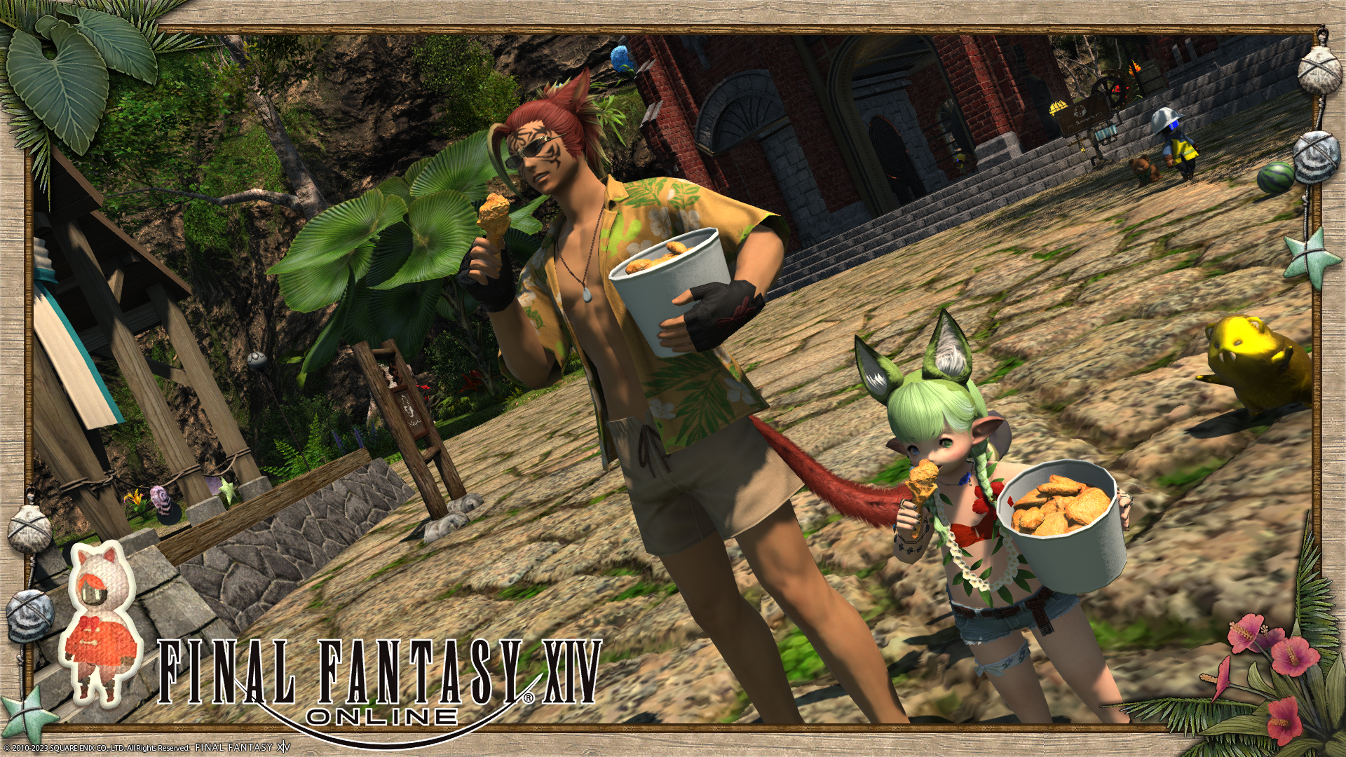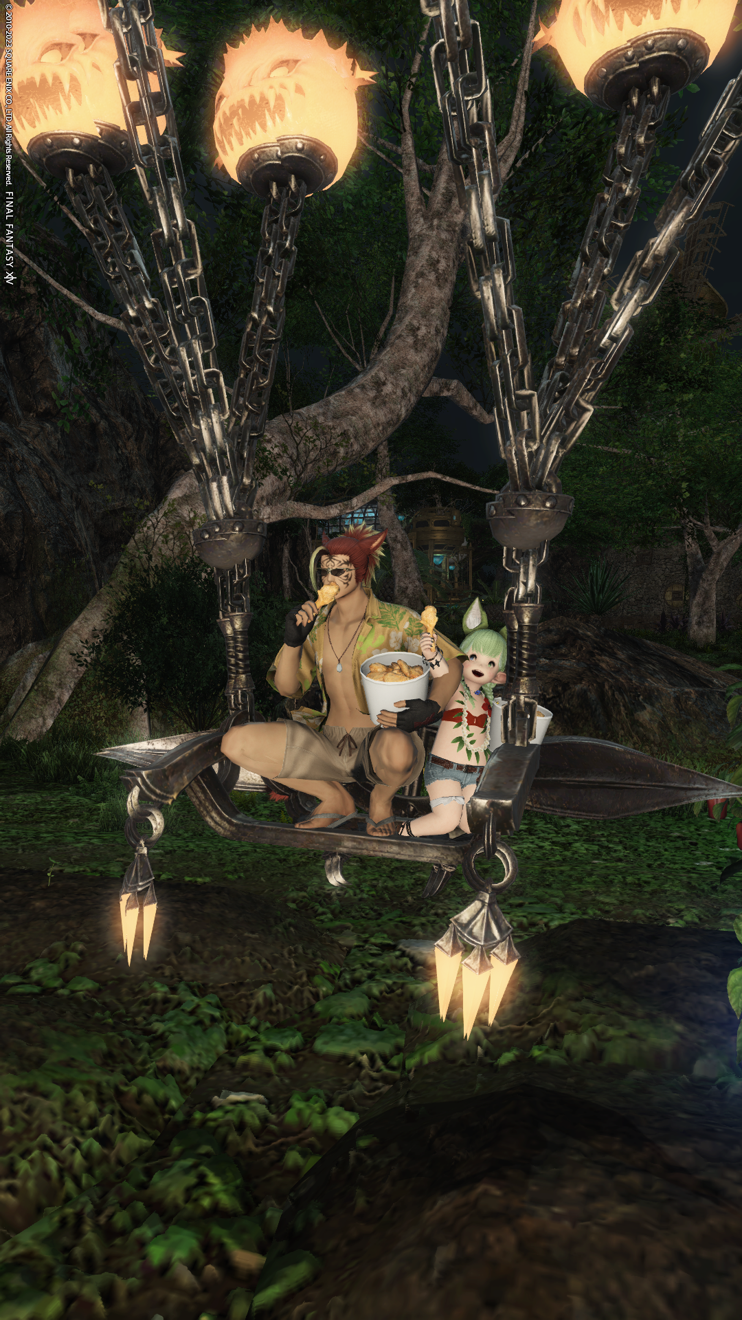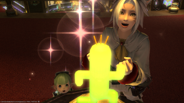 サボテンに照らされて若干顔がホラーよりのミコッテさん!怪談のとき下からライトあてるやつ……。