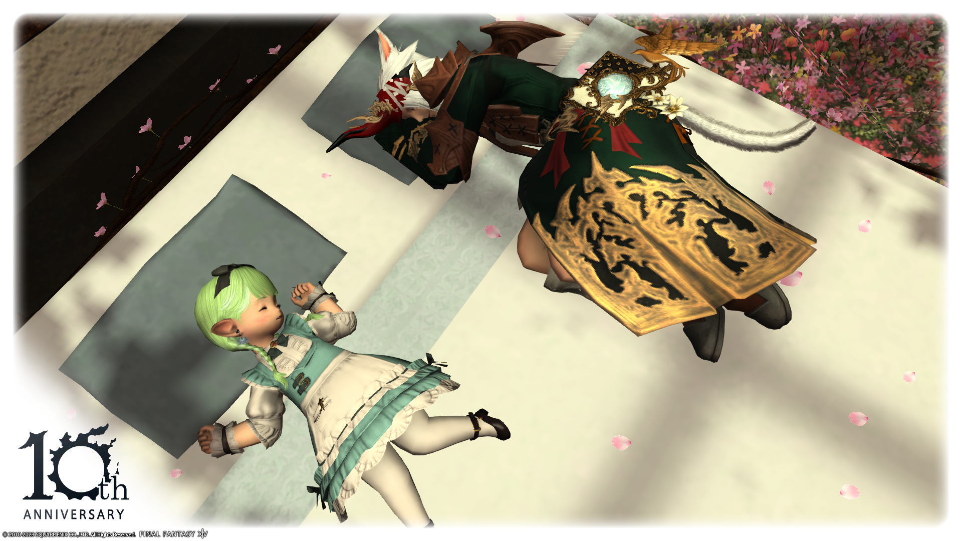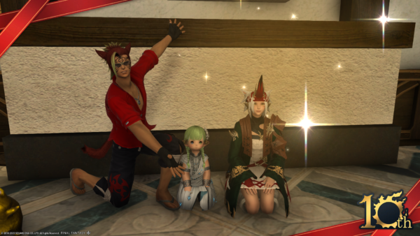 FF14でチャットしながら、FF7のスマホのゲームをマルチで遊んでいるのでありました。姿は写っておりませんが、壁の裏にひそかにもう一人ミコッテさんもいたりします。