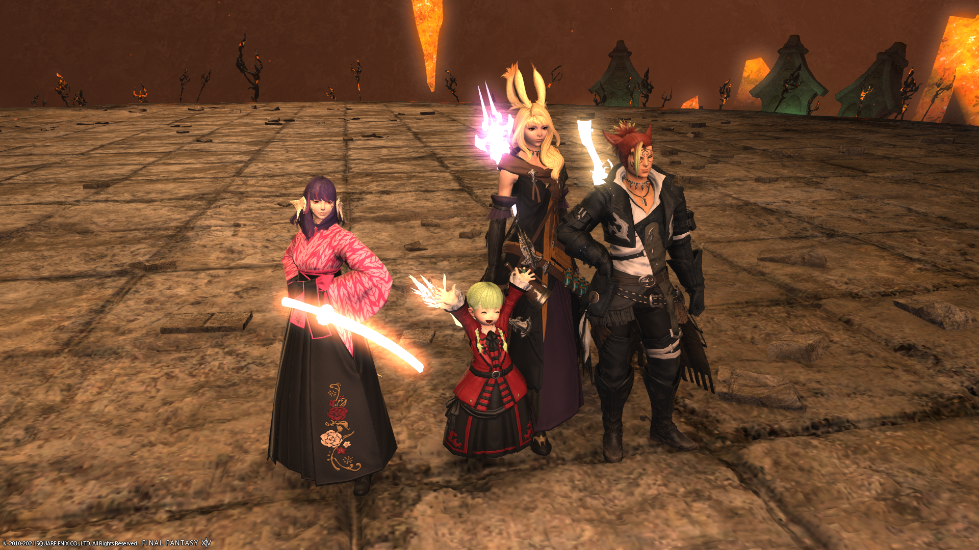 宝箱に入りたがる元タルタルと、後ろの方(よく見ると脱出口のもやもやのところ)でいつもどおり踊り続けるヴィエラさん…。なかなかのホラー。
