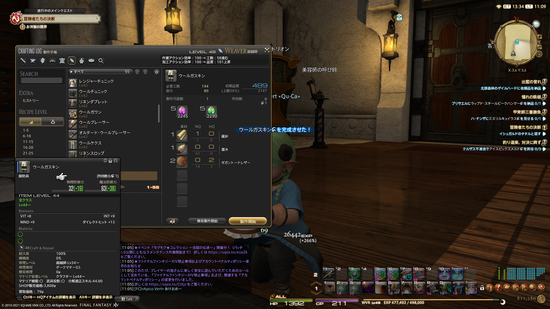 裁縫ギルドのジョブクエストは終わったけど、まだ彫金も木工も錬金術も革細工も…終りが見えませぬ…。何度もマーケットで購入して納品すれば楽だけど、自分で作りたい性分なのですよね。