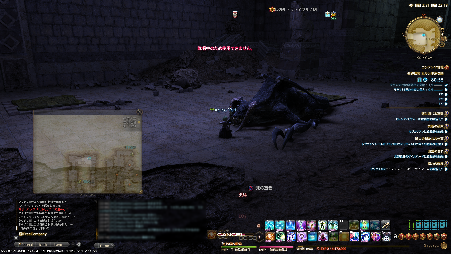 なっ何事!?最初なぜ転がったかわからなかったのだけど、死の宣告でした…。う、後ろ向けば避けられたのかな…?カーズナはないからエスナで治ったのかな…?などとその時は考える余裕もなく。