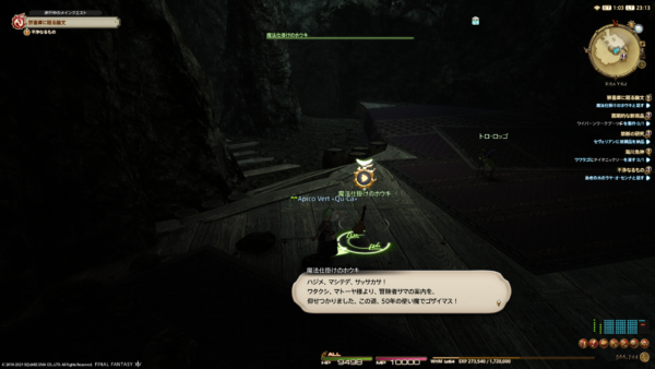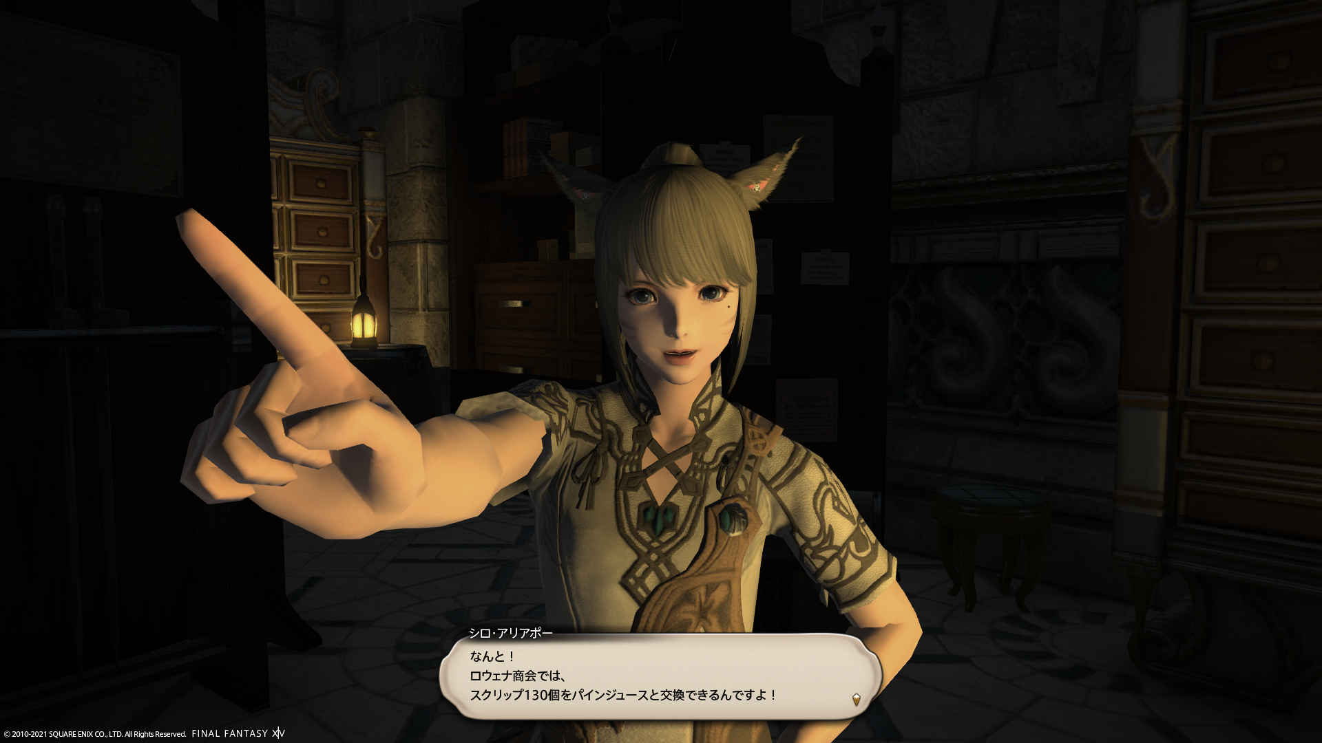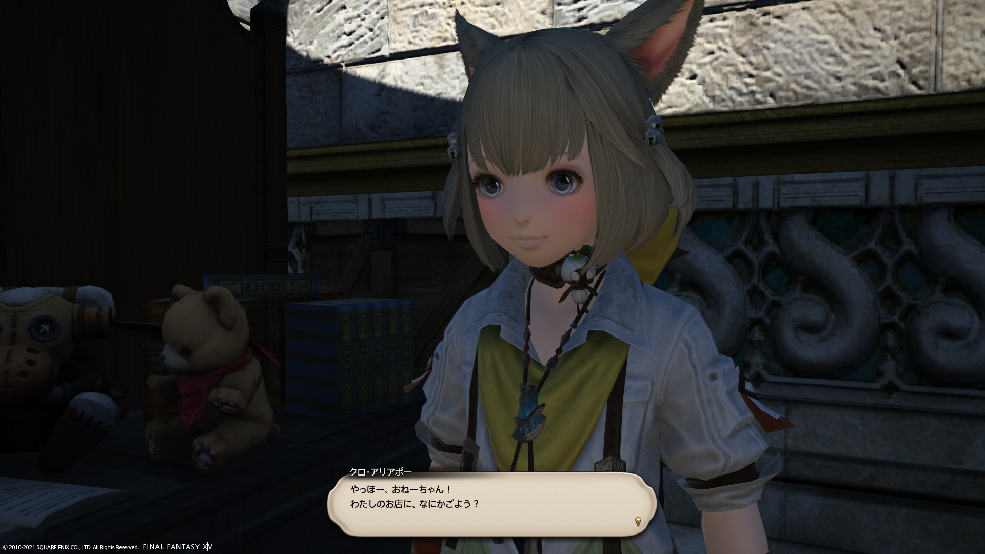 途中立ち寄ったイディルシャイアで出会った、子ミスラ…じゃなくて子ミコッテちゃん。目が大きくて、お人形のよう…。古いとこだとプーリップ、最近だのとハルモニアブルームみたいな…。