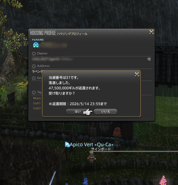 もうお家建ってた……。結果を見ずともはずれがわかる。そして4750万ギルのお金持ちになりました。