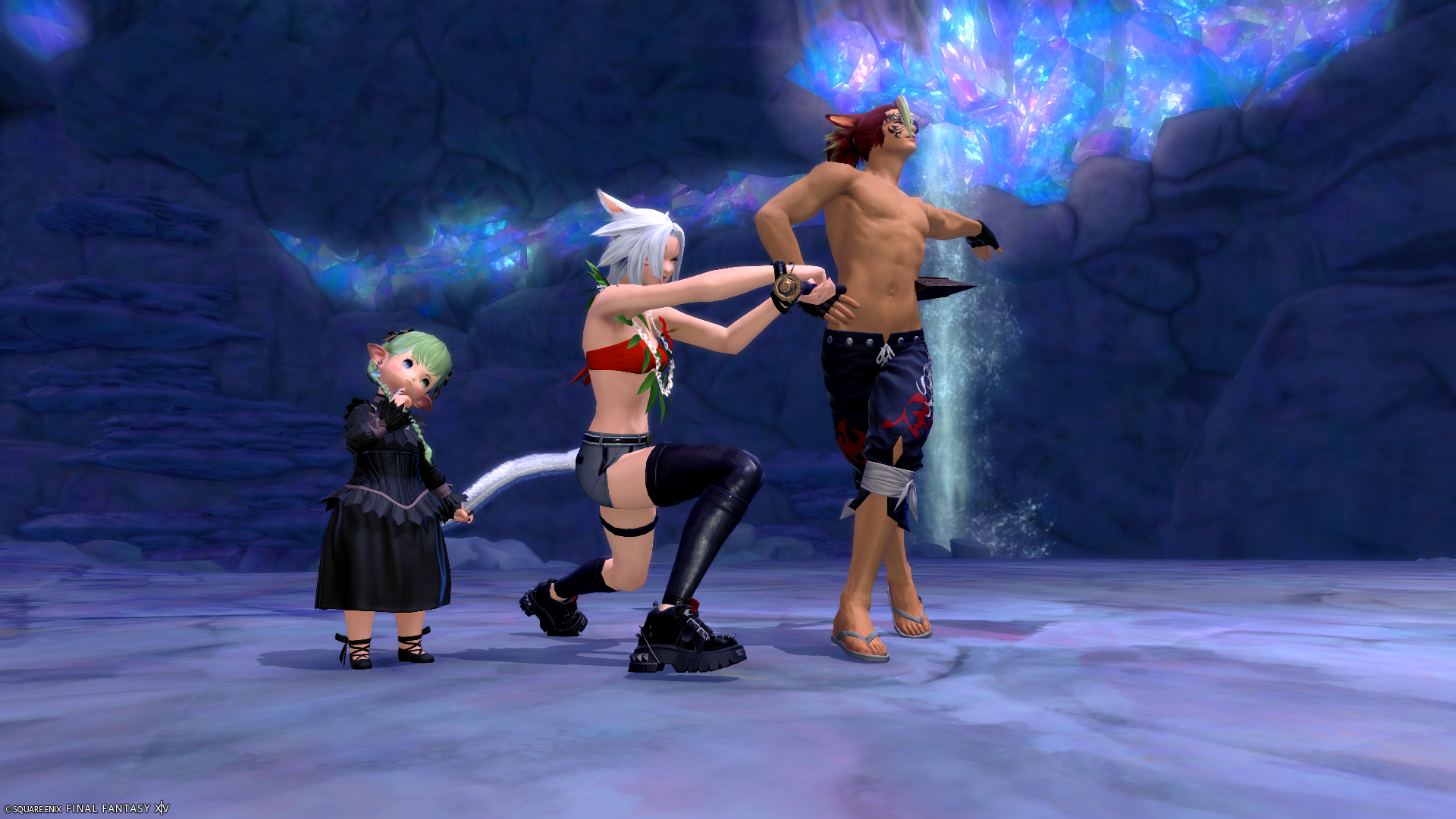 海がきれいなので水着でくればよかったなーとか話ていたら、いきなり脱ぎだしたミコッテを斧ですっぱりするミコッテさん。