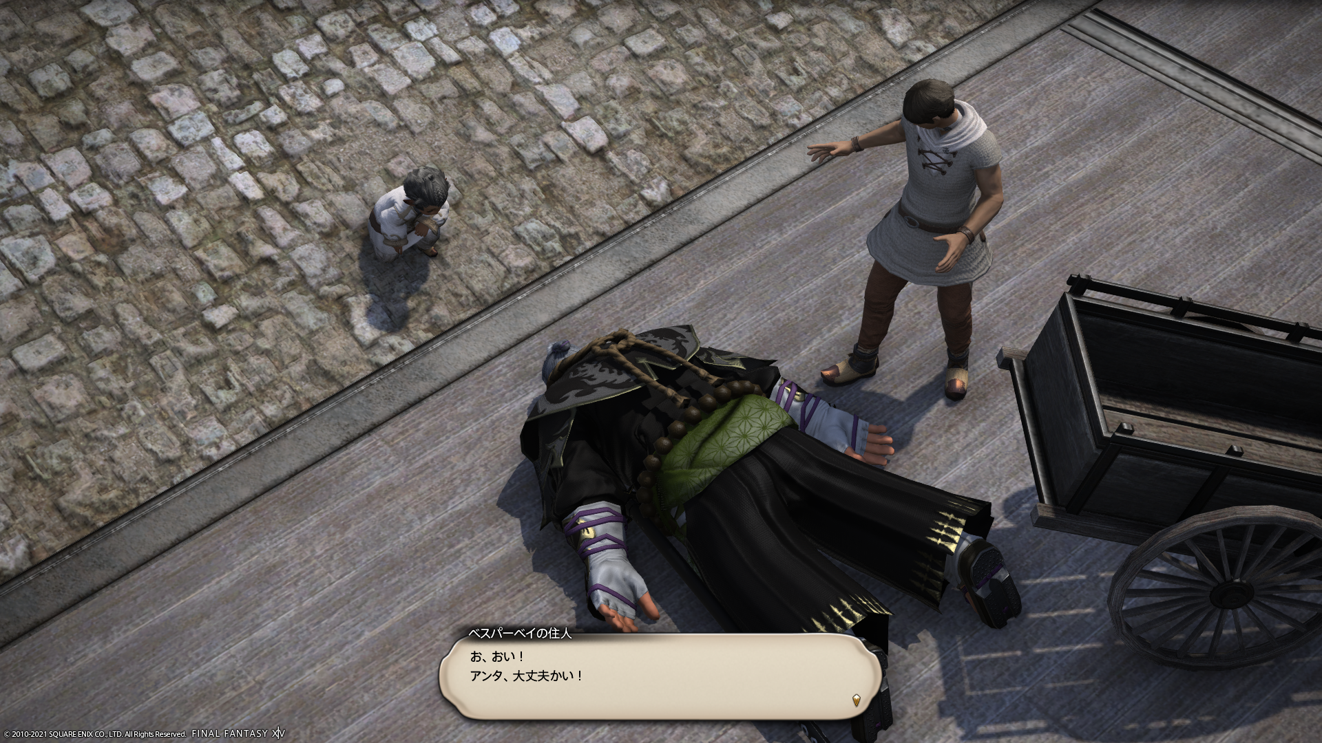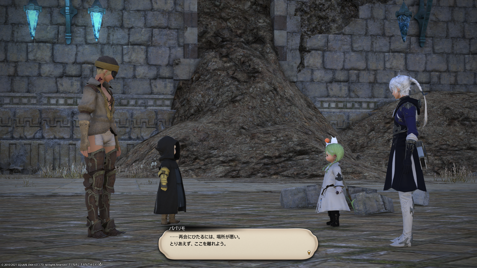 暁にとっては大事件となった祝賀会の後、アラミゴ解放軍に身を寄せていたというパパリモさんとイダさん。現在アラミゴ解放軍を手伝っている関係で、二人は鉄仮面につてがあるとのこと。二人に鉄仮面を呼び出してもらい、難民に扮したアルフィノさんとワタクシ冒険者とご対面。