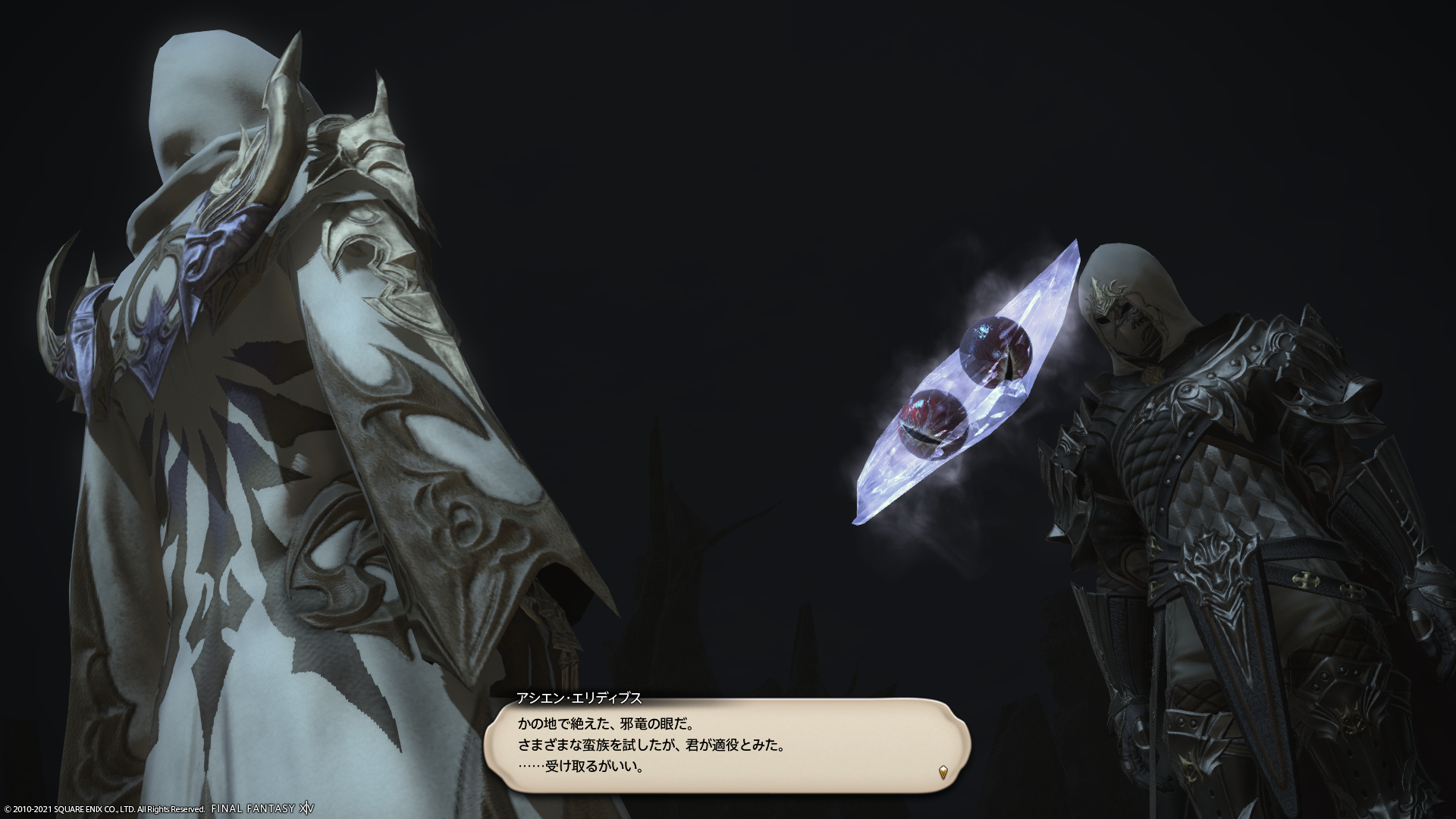 白き衣のアシエンに、竜の目を託される鉄仮面。その目はっその目はぁぁぁぁっ!雲海に投げ捨てたバハムートの目では…?あのとき、誰かが拾ったりしないかなーと危惧したのだけど、その通りだったよう…。