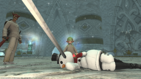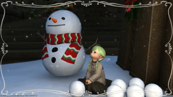 イシュガルドの蒼天街で受けたクエストでウルダハに来たら雪だるまと雪玉が!それにしてもでっかい雪玉だなぁ…。