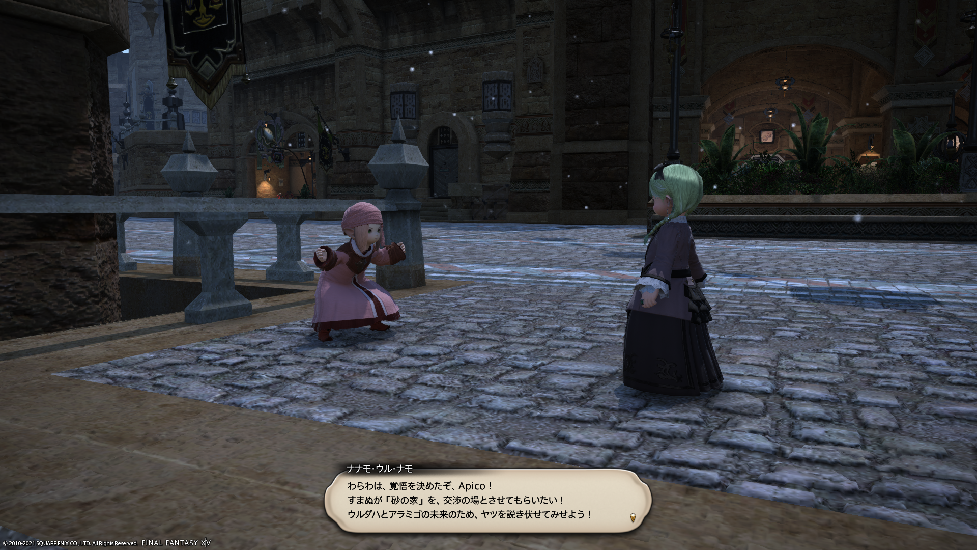 ラウバーンさんはウルダハでの任を解かれアラミゴに戻ることになり、ナナモ様の右腕にはピピンさんが就くそうですが、ピピンさんではナナモ様を小脇に抱えたりできないよね…残念です。