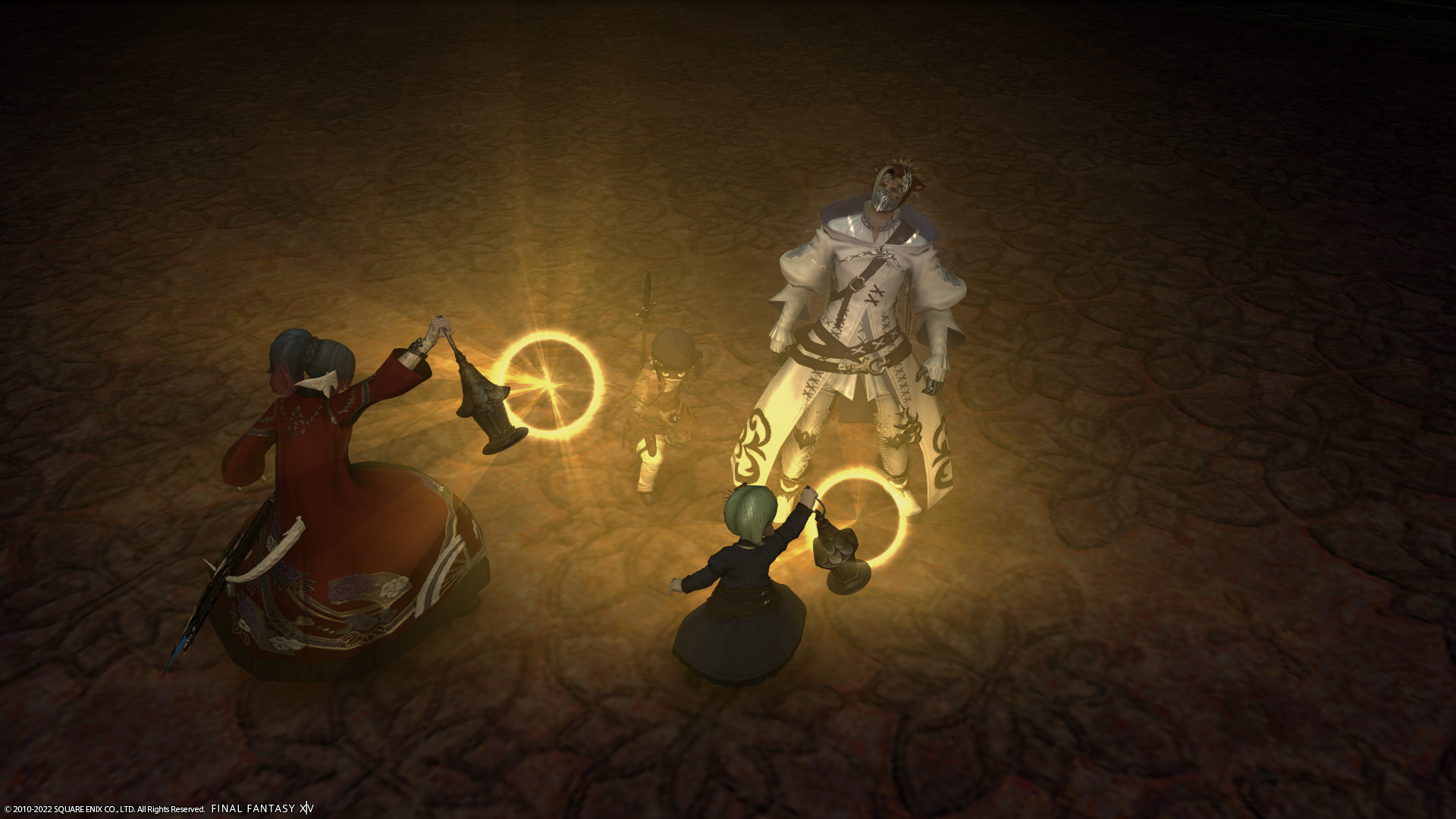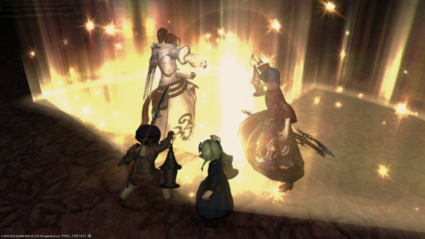 ということで、現在開催中のハロウィンイベントダンジョンへ。なぜか、みんなから光を当てられるFCメンバーのミコッテ♂さん。そして、ノリノリでやられてる…。