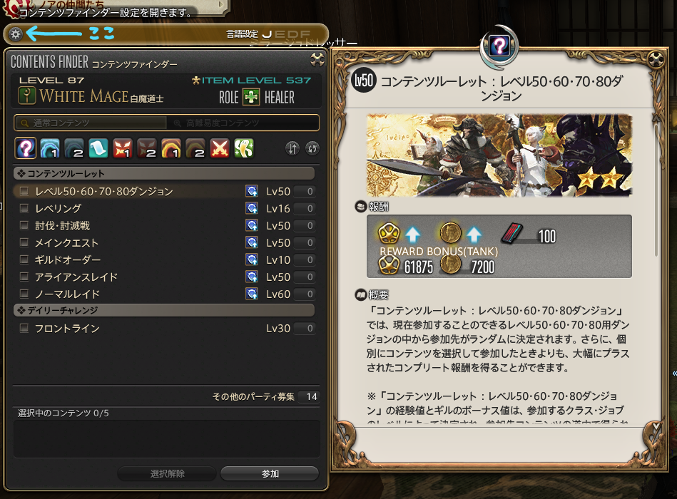 私のメインクエスト進行の時、最初の頃3人で入る時はずっと「下限アイテムレベルでの参加」設定で挑んでおりました。おかげで?ダンジョン攻略の際、よくボス戦などで失敗して、何度もやり直したりしたなぁ。初心者ばかりで慣れてないのに、人数が1人減った上、下限アイテムLv制限をかけて、自分たちで難易度あげちゃってたという。おかげで鍛えられたかも…?