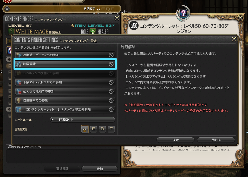 制限解除を選択すると、人数制限やLv制限などの制限を解除した状態で、コンテンツを進行できます。