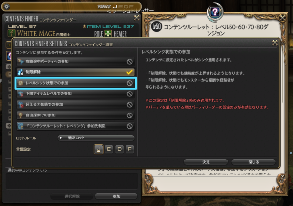 最初、このレベルシンクの設定があることを知らなくて、3人でコンテンツをクリアするときに「下限アイテムレベルでの参加」にしていて、より難易度高い状態で挑戦していたのですよね…。