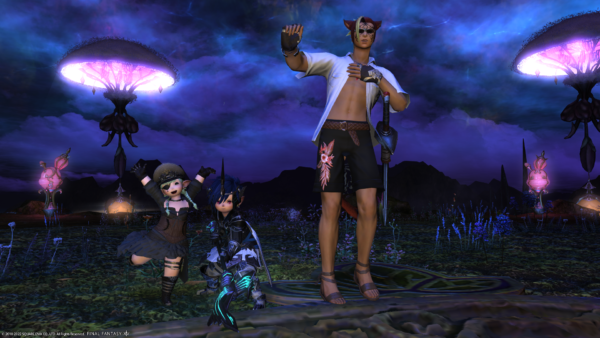 アウラさんに「変な格好のスクリーンショット撮れた!」と報告したら、楽しみにされていたので載せておきますね><;白い装備の2人は有料のエモーションで踊ってました。ペアの漫才師のようでした…。