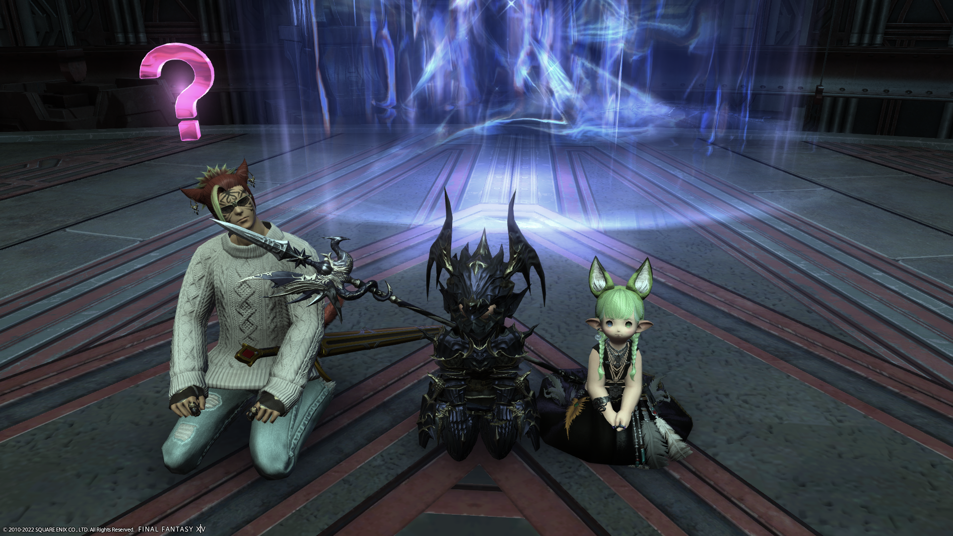 グループポーズにすると、ミコッテさんの「?」エモートが座った状態でも再生されていたのだけど、御本人だと出てこなかったそうです。なにの違いがあるのかなぁ…。