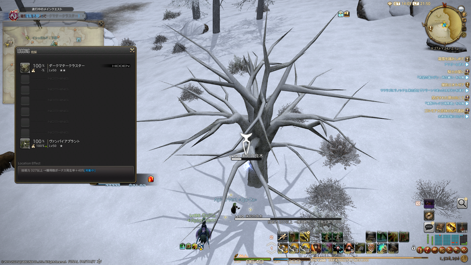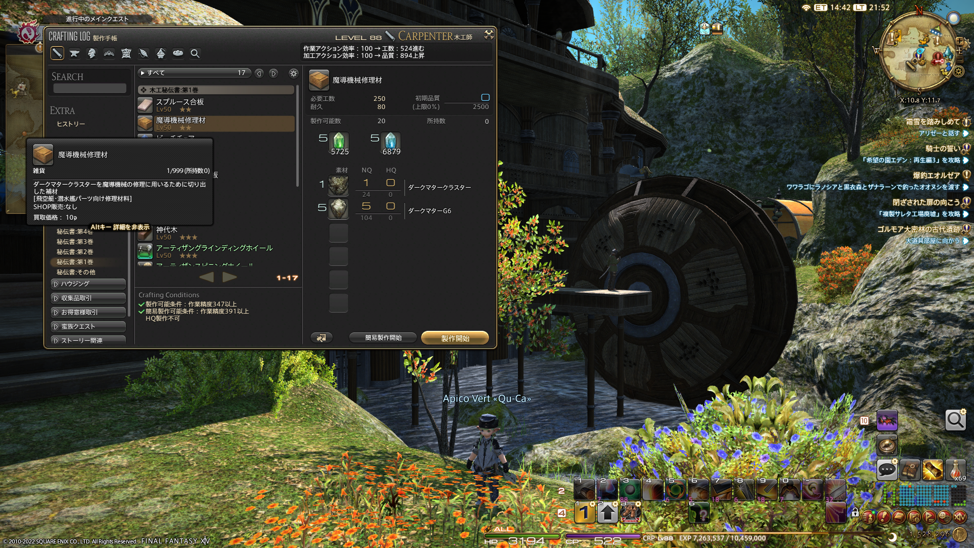 幸いダークマタークラスター調達の機会は割りと多いのですよね。クルザス中央をよくマウントで移動するので、通りかかりに未知を見つけると採るようにしています。